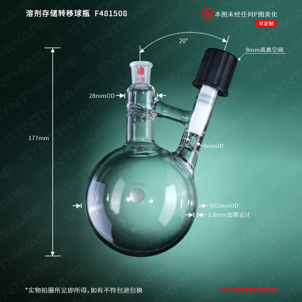 溶剂存储转移球瓶,磨口:14/20,500ml,8mm高真空阀 F481508