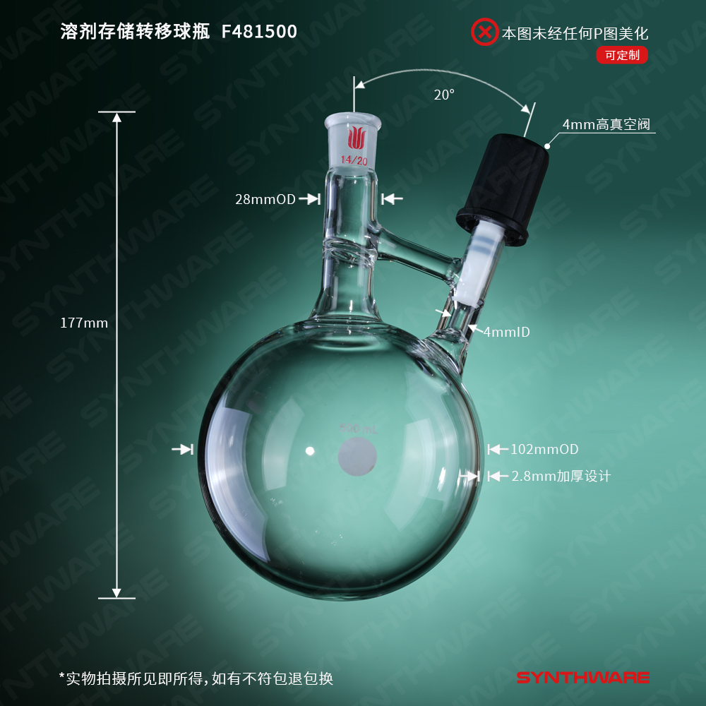 溶剂存储转移球瓶,磨口:14/20,500ml,8mm高真空阀 F481508