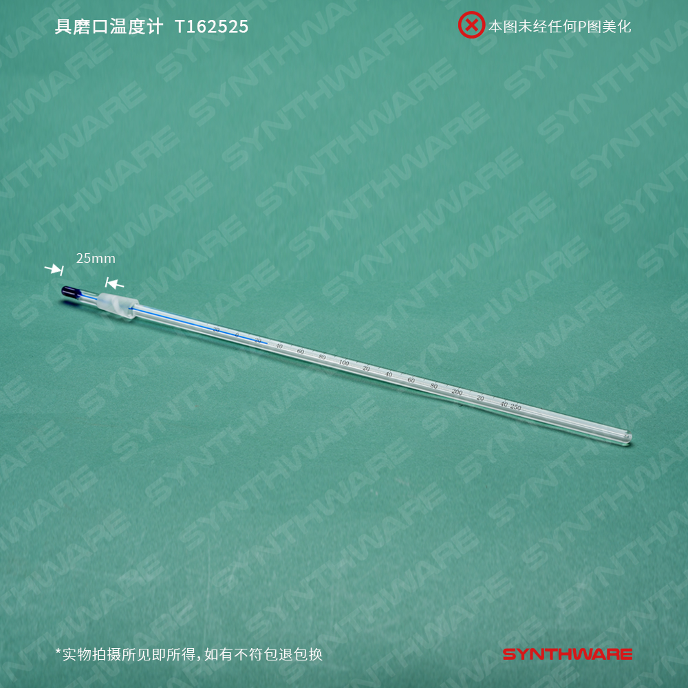 精确度为:±1℃(-20 to 110℃), ±2℃(-20 to 250℃),具11#磨口,以达到温度计重量轻、体积小的效果。温度计内部液体为计量用蓝色或红色煤油,既便于观察,又没有水银的毒性。温度计储存必须竖放或横放,严禁倒放,如在物流运输中液体出现断层,可以用酒精灯在顶部烘烧,注意观察红(蓝)液体是否连接(注意:红(蓝)液线不能到顶!)再在底部磨口下面烘烧,在有热气压力的情况下,可以恢复红(蓝)液的断层情况,如断层严重可多次烘烧,直到断层连接为止。