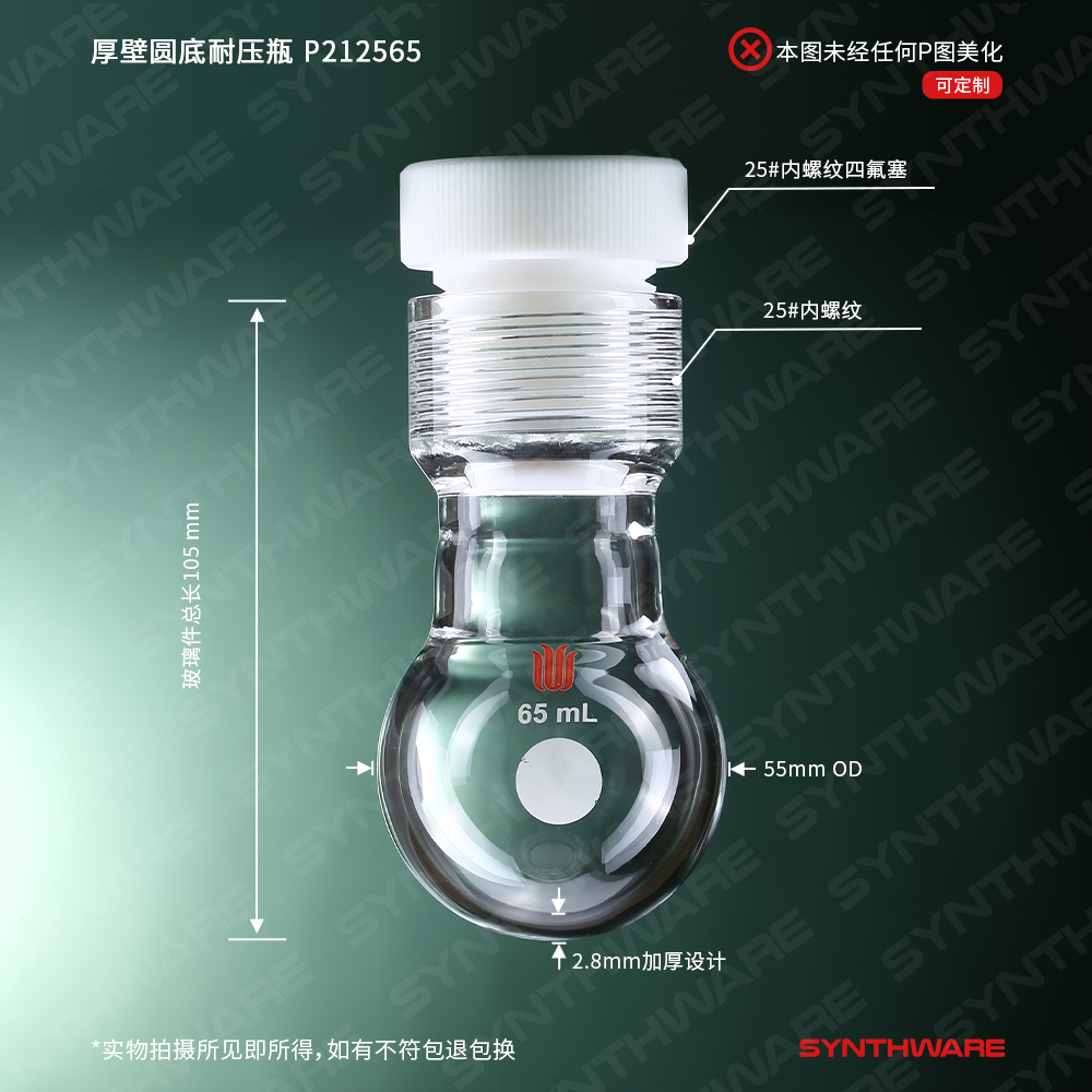 # #25内螺纹厚壁球型耐压瓶,标配有四氟螺纹盖(B100025G)以及四氟包覆O型圈(R212QB)