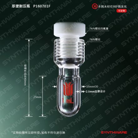 耐压瓶 > 厚壁耐压瓶 > 防腐密封圈(细管)耐压瓶 > SYNTHWARE > 厚壁耐压瓶,四氟全包O型圈,1ml,7#内螺纹,外径*有效长度mm15*25 P160701F