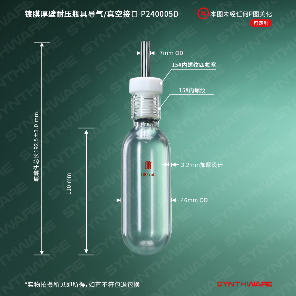 耐压瓶 > 厚壁耐压瓶 > 镀膜-具导气/真空接口(防腐密封圈)耐压瓶 > SYNTHWARE > 库存售完即止,镀膜厚壁耐压瓶具导气/真空接口,容量100,外径*长度:46*110MM P240005D