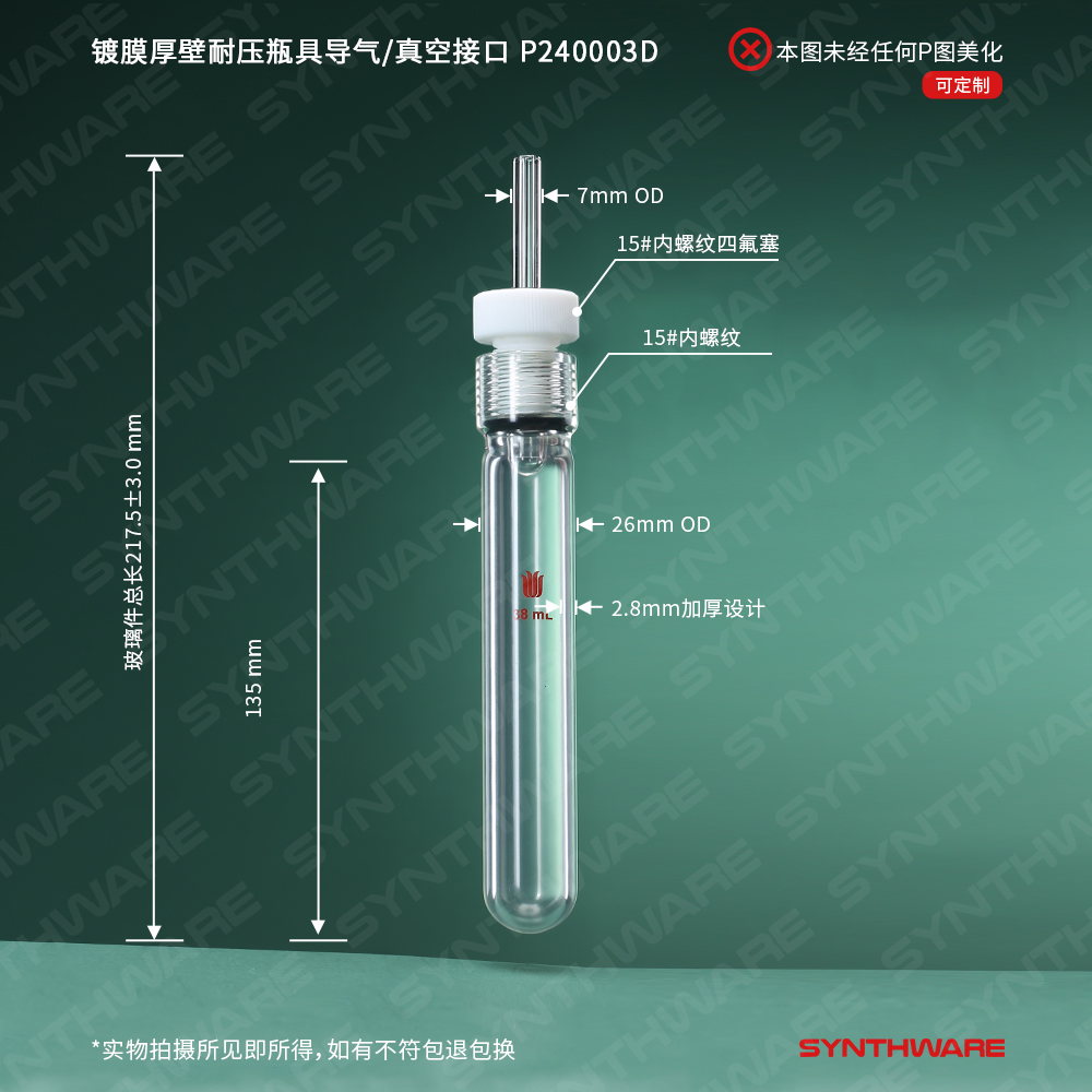 耐压瓶 > 厚壁耐压瓶 > 镀膜-具导气/真空接口(防腐密封圈)耐压瓶 > SYNTHWARE > 库存售完即止,镀膜厚壁耐压瓶具导气/真空接口,容量:38,外径*长度:26*135MM P240003D