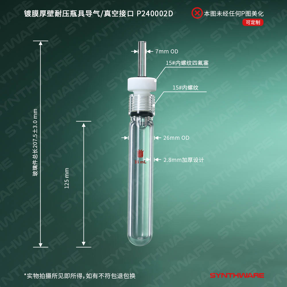 耐压瓶 > 厚壁耐压瓶 > 镀膜-具导气/真空接口(防腐密封圈)耐压瓶 > SYNTHWARE > 库存售完即止,镀膜厚壁耐压瓶具导气/真空接口,容量:35,外径*长度:26*125MM P240002D