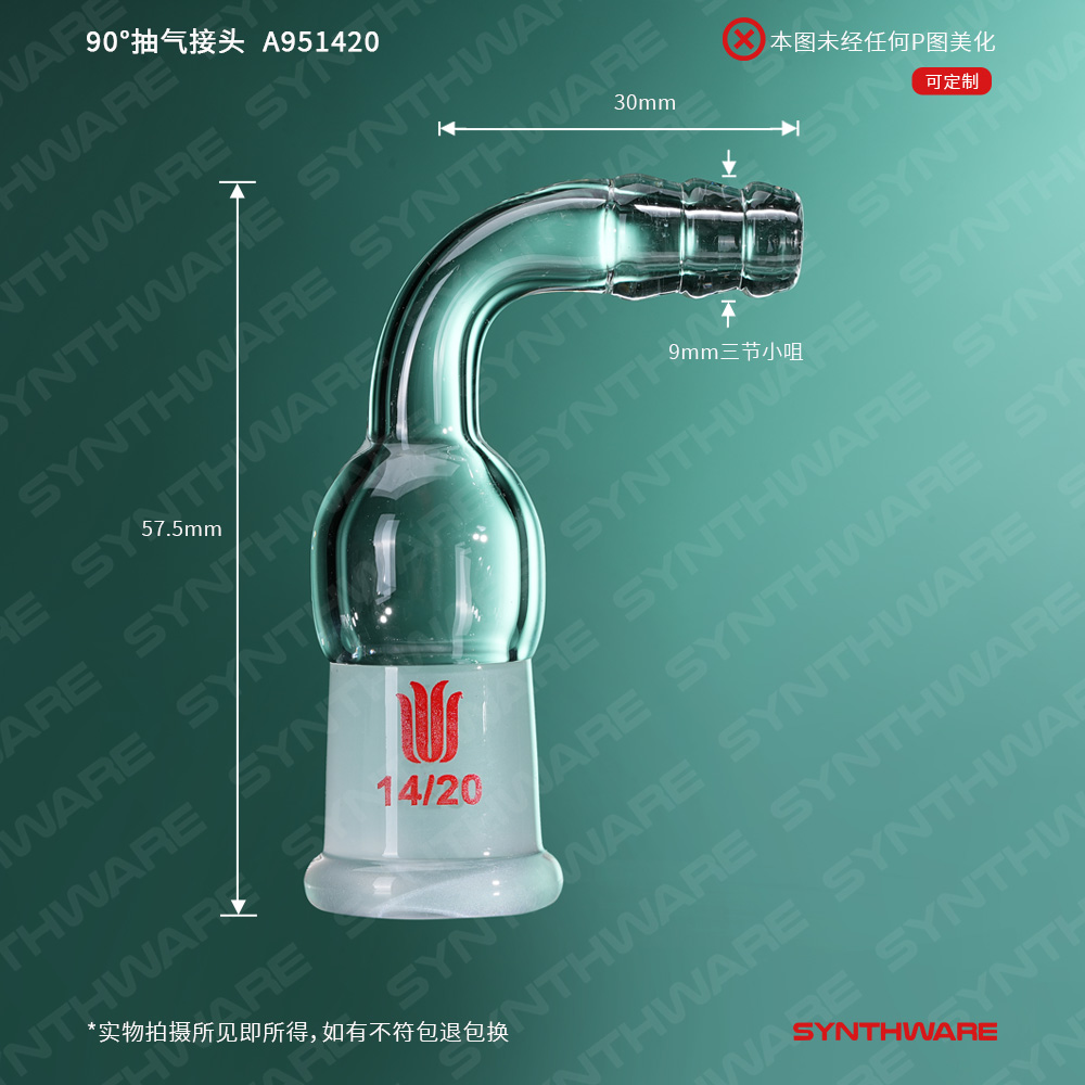 接头类 > 抽气接头 > 90°-内磨口抽气接头 > SYNTHWARE > 90°抽气接头,内磨口:14/20,φ8小咀接口 A951420