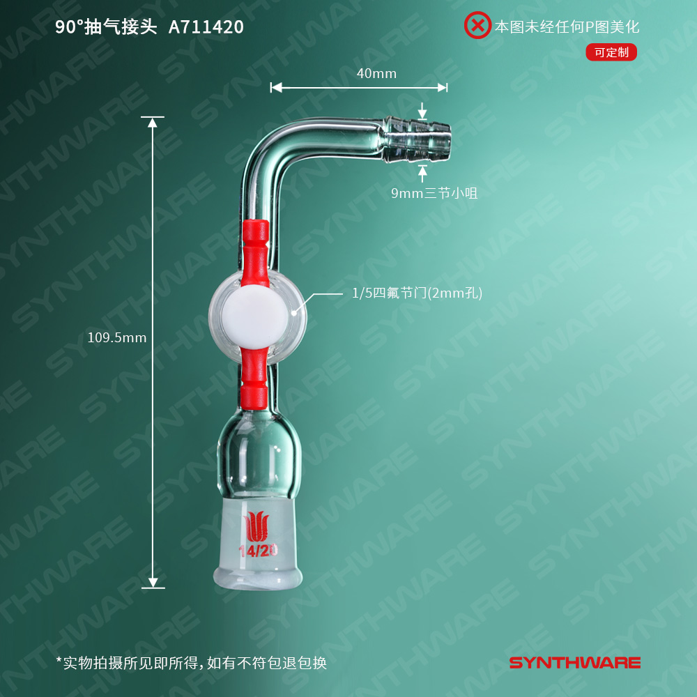 90°抽气接头,内磨口,具四氟节门,14/20,2mm节门孔径 A711420