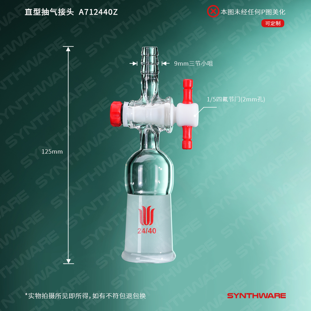 接头类 > 带节门抽气接头 > 直型四氟节门-内磨口抽气接头 > SYNTHWARE > 直型抽气接头,内磨口,具四氟节门,24/40,2mm节门孔径 A712440Z
