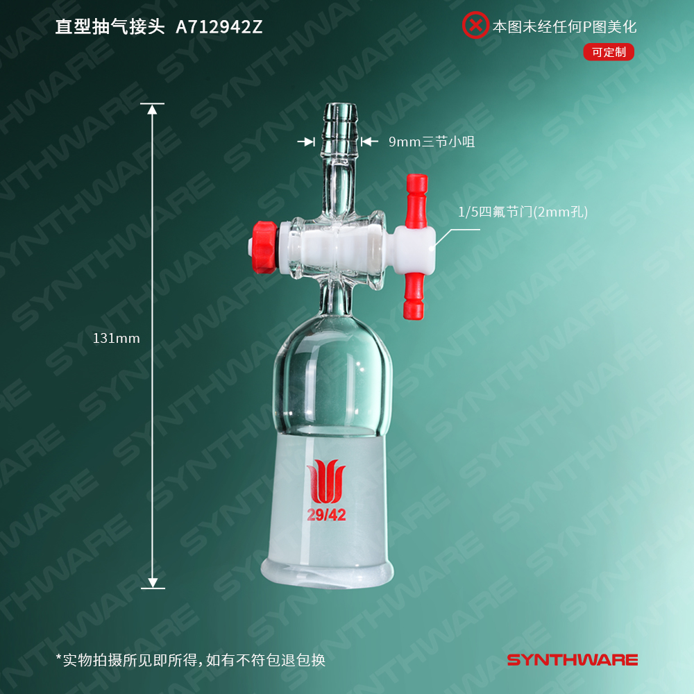 接头类 > 带节门抽气接头 > 直型四氟节门-内磨口抽气接头 > SYNTHWARE > 直型抽气接头,内磨口,具四氟节门,29/42,2mm节门孔径 A712942Z