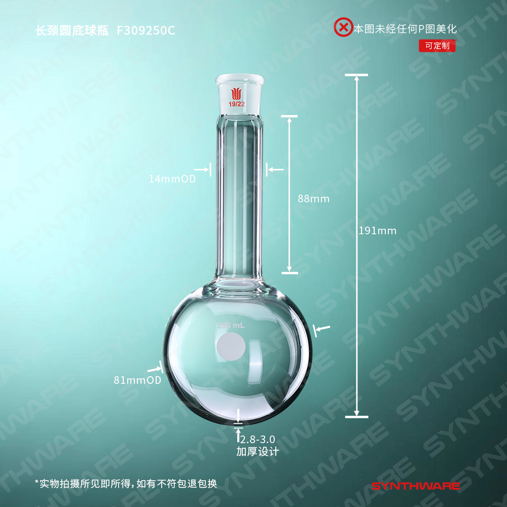 长颈圆底烧瓶,磨口:19/22,容量:250ml,颈长度:88mm F309250C