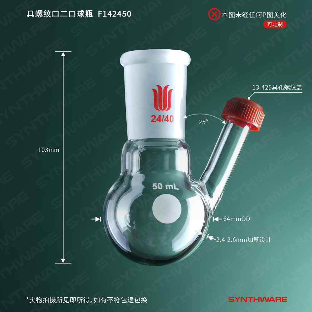 具螺纹口二口球瓶,磨口:24/40,50ml F142450