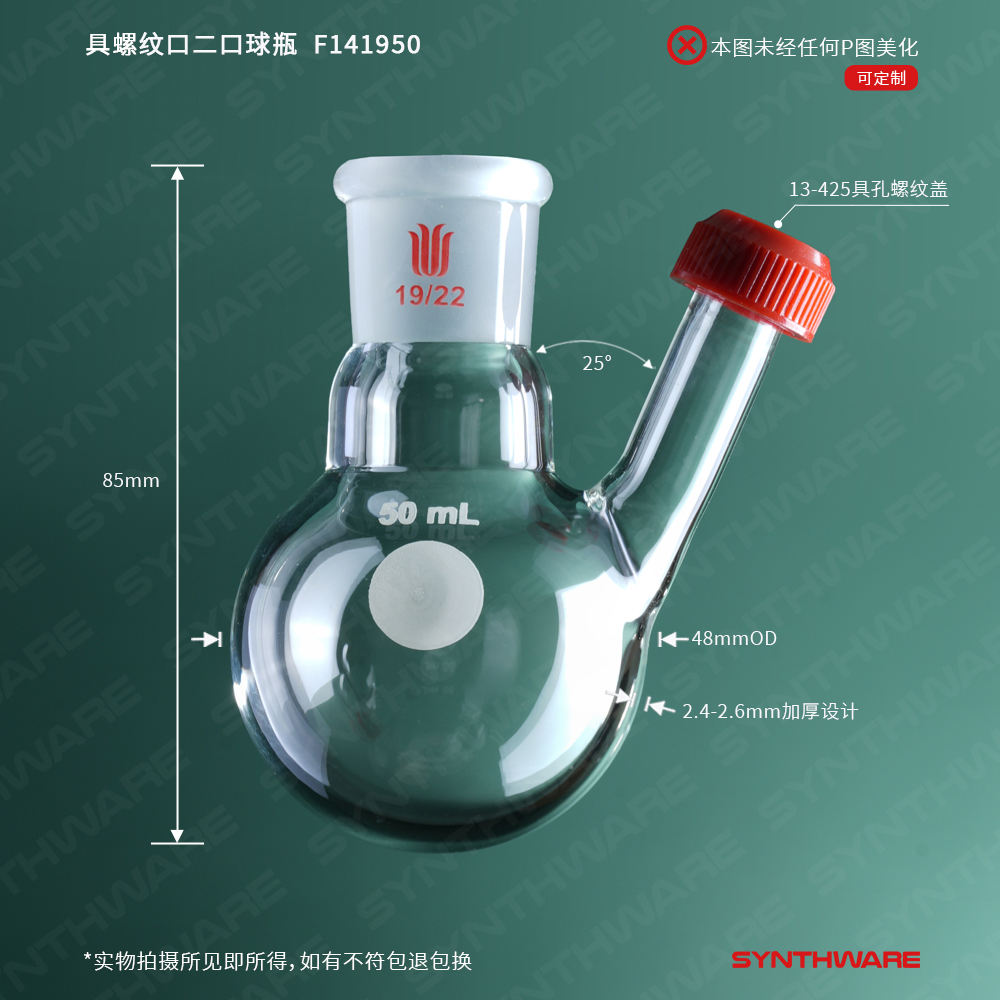 具螺纹口二口球瓶,磨口:19/22,50ml F141950