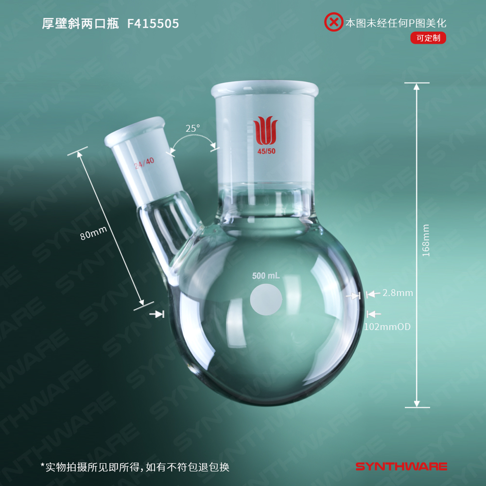小角度斜两口瓶,厚壁高强度,中间磨口:45/50,侧磨口:24/40,500ml F415505X