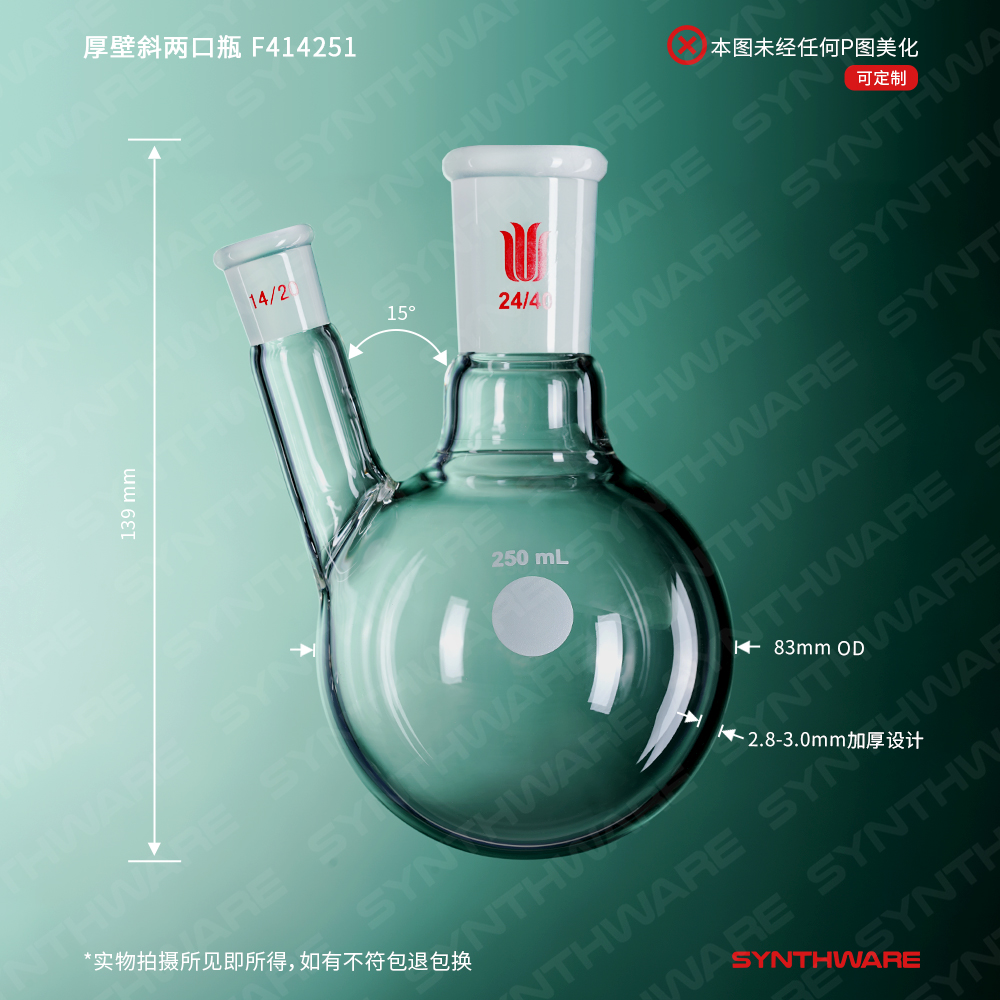 小角度斜两口瓶,厚壁高强度,中间磨口:24/40,侧磨口:24/40,250ml F414250X