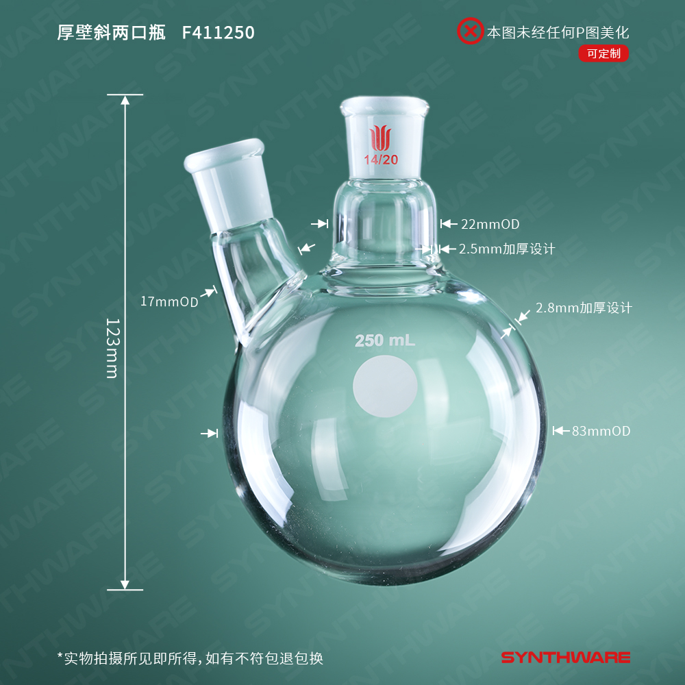 小角度斜两口瓶,厚壁高强度,中间磨口:24/40,侧磨口:24/40,250ml F414250X
