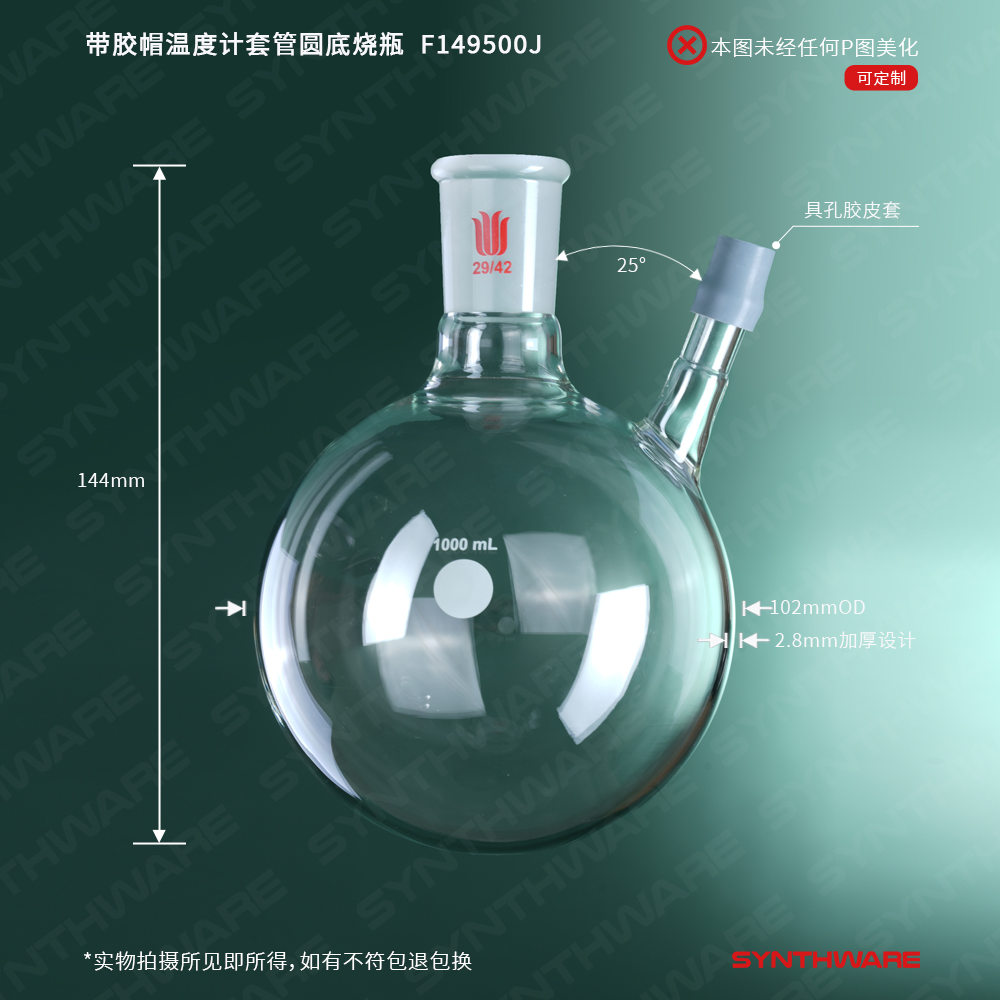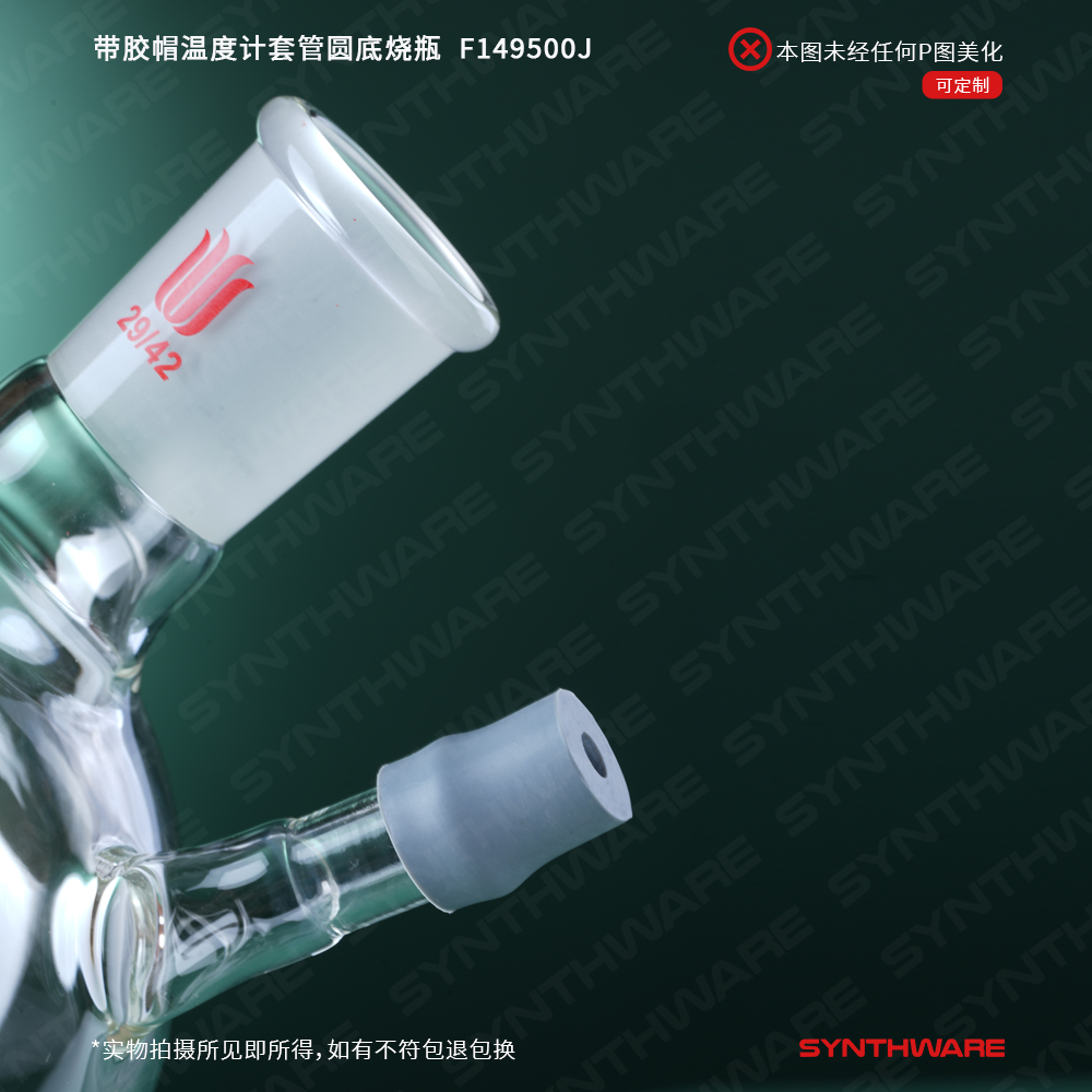 球瓶类 > 两口球瓶 > 带胶帽温度计套管两口球瓶 > SYNTHWARE > 带胶帽温度计套管圆底烧瓶,容量:500ml,磨口:19/22 F149500J