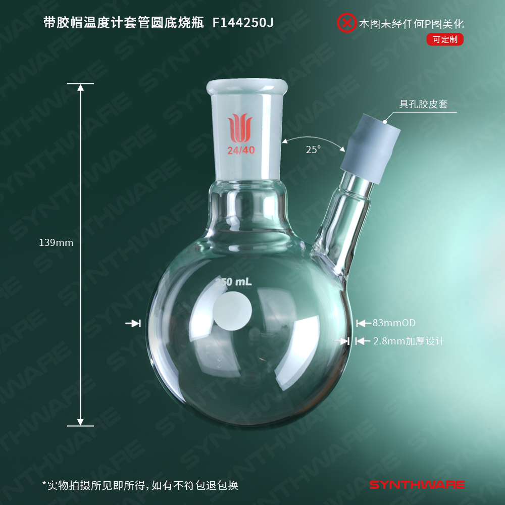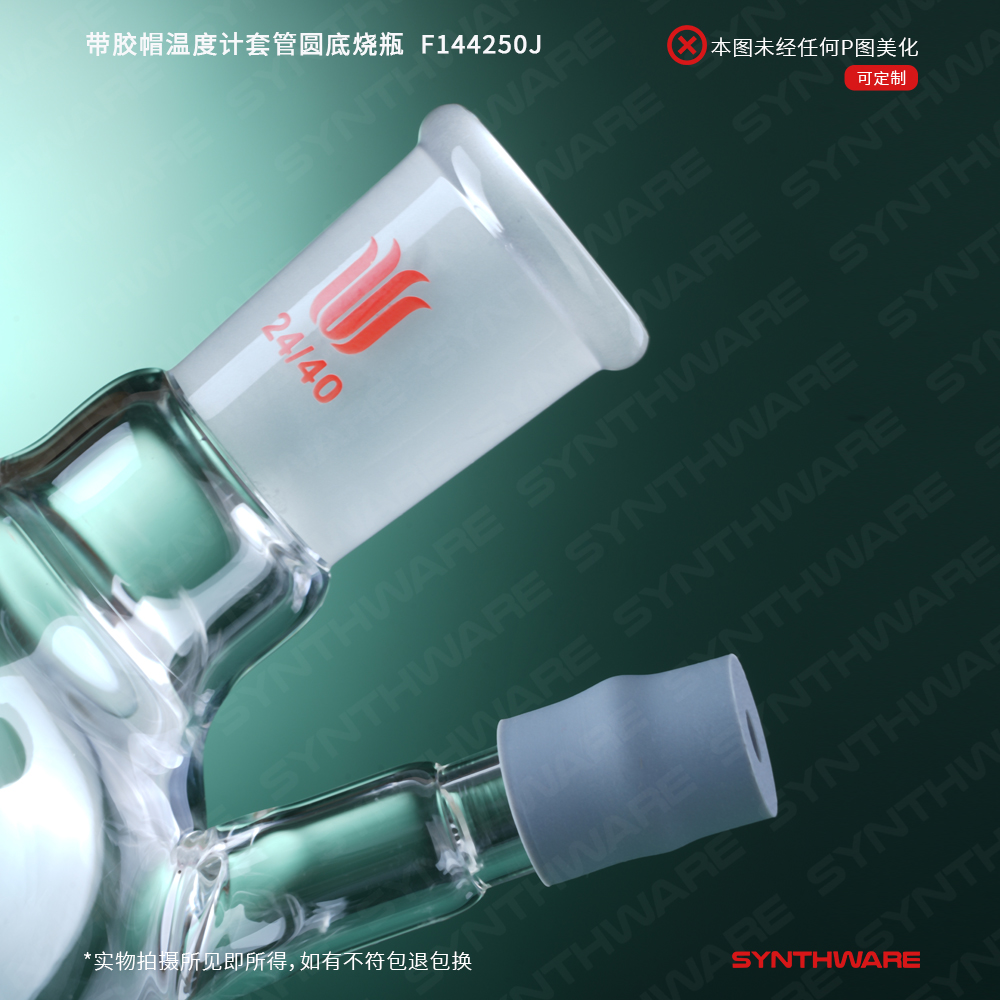 球瓶类 > 两口球瓶 > 带胶帽温度计套管两口球瓶 > SYNTHWARE > 带胶帽温度计套管圆底烧瓶,容量:250ml,磨口:24/40 F144250J