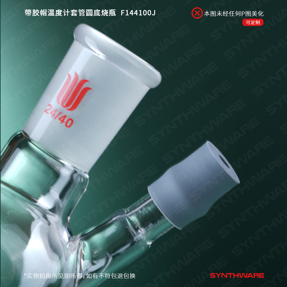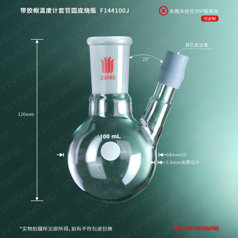 球瓶类 > 两口球瓶 > 带胶帽温度计套管两口球瓶 > SYNTHWARE > 带胶帽温度计套管圆底烧瓶,容量:100ml,磨口:24/40 F144100J