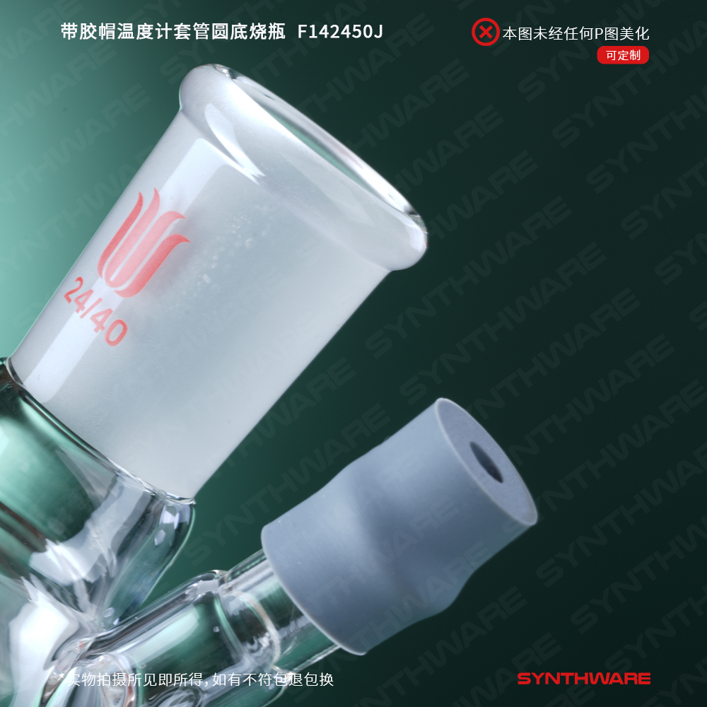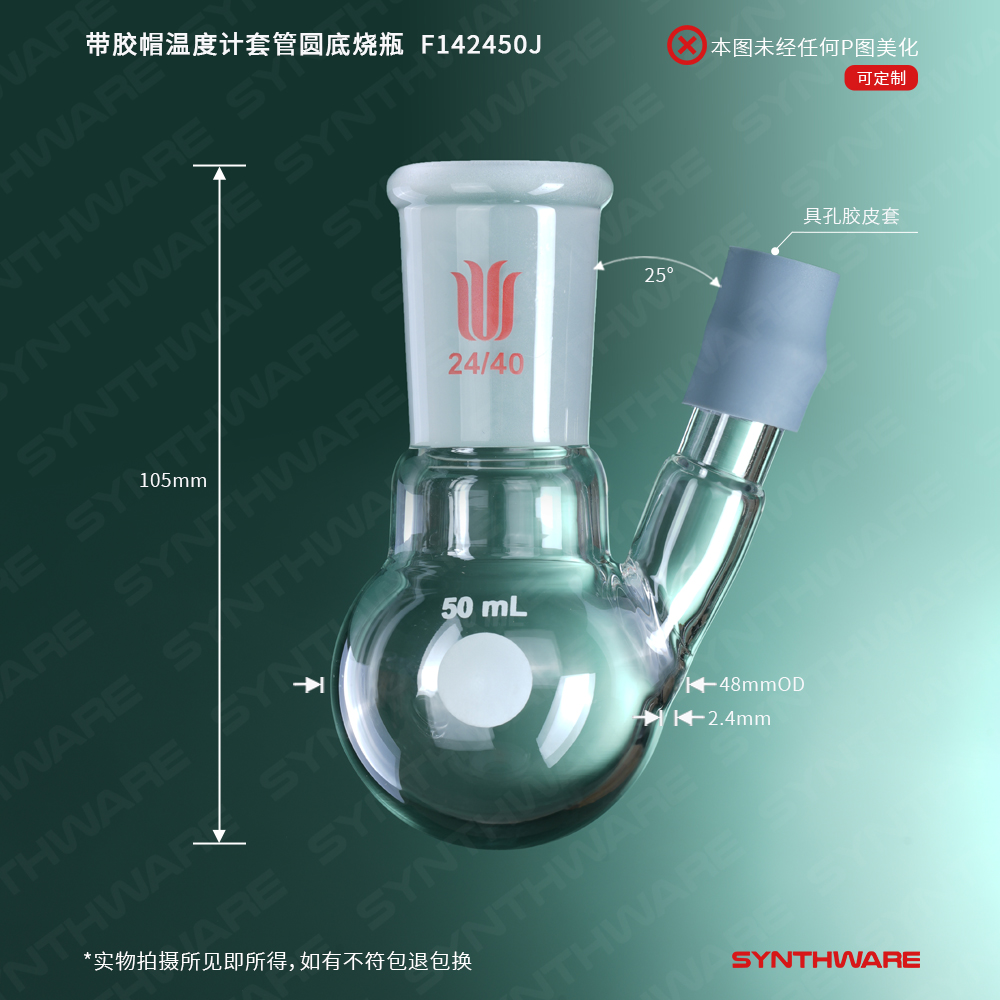 球瓶类 > 两口球瓶 > 带胶帽温度计套管两口球瓶 > SYNTHWARE > 带胶帽温度计套管圆底烧瓶,容量:50ml,磨口:24/40 F142450J