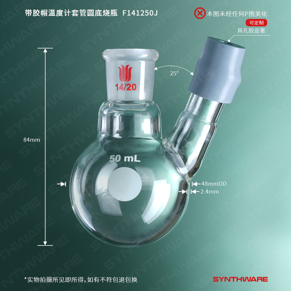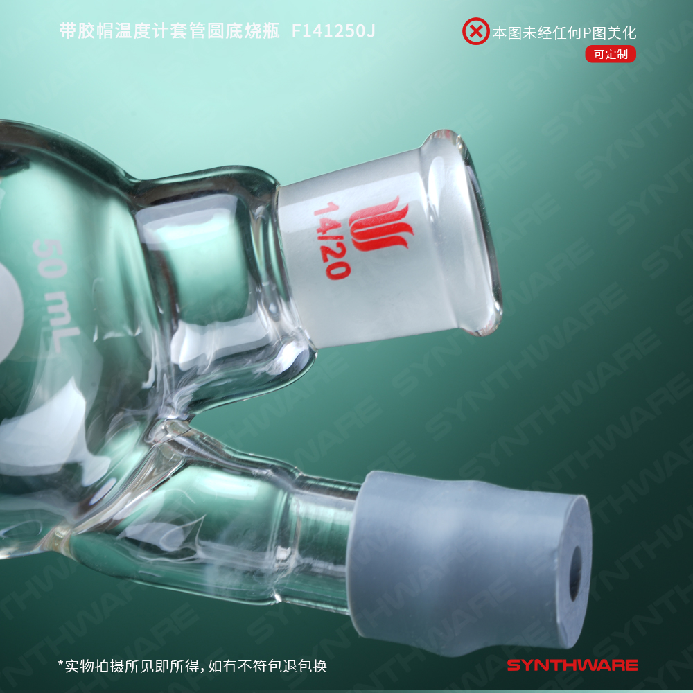 球瓶类 > 两口球瓶 > 带胶帽温度计套管两口球瓶 > SYNTHWARE > 带胶帽温度计套管圆底烧瓶,容量:50ml,磨口:14/20 F141450J