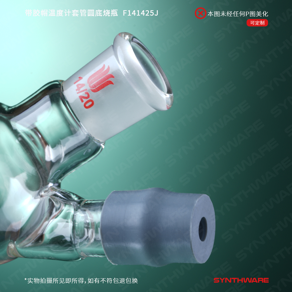 球瓶类 > 两口球瓶 > 带胶帽温度计套管两口球瓶 > SYNTHWARE > 带胶帽温度计套管圆底烧瓶,容量:25ml,磨口:14/20 F141425J