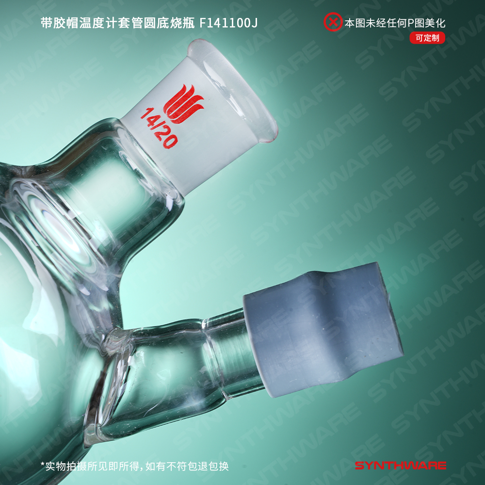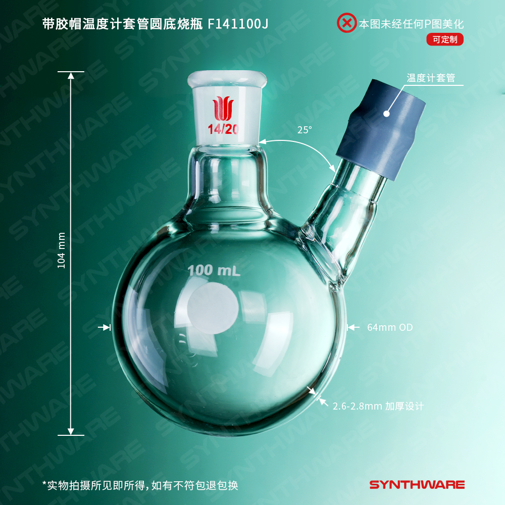 球瓶类 > 两口球瓶 > 带胶帽温度计套管两口球瓶 > SYNTHWARE > 带胶帽温度计套管圆底烧瓶,容量:100ml,磨口:14/20 F141100J