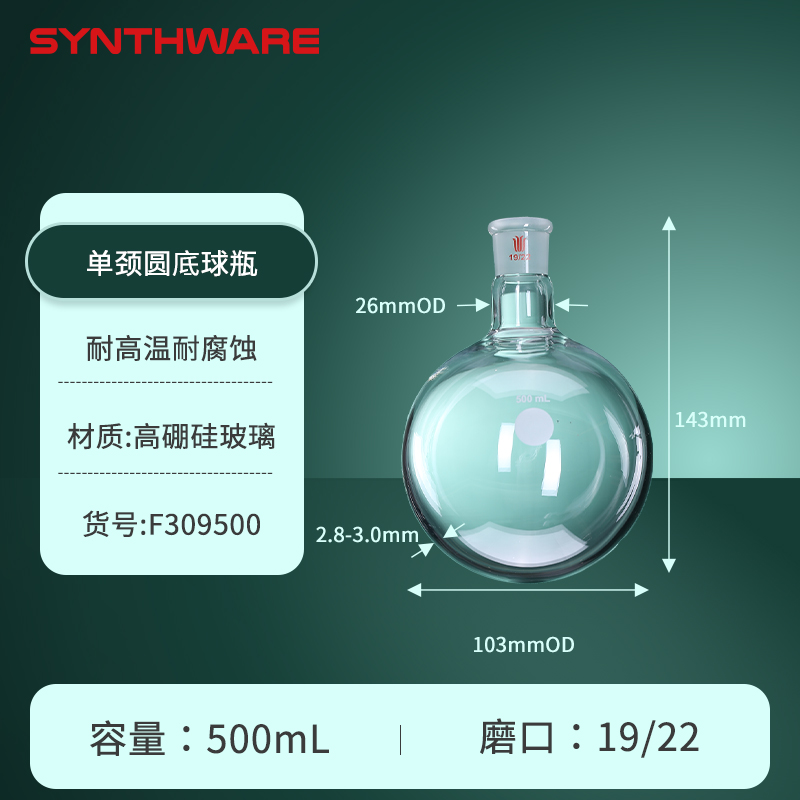 单颈圆底球瓶,厚壁高强度,磨口:19/22,500ml F309500