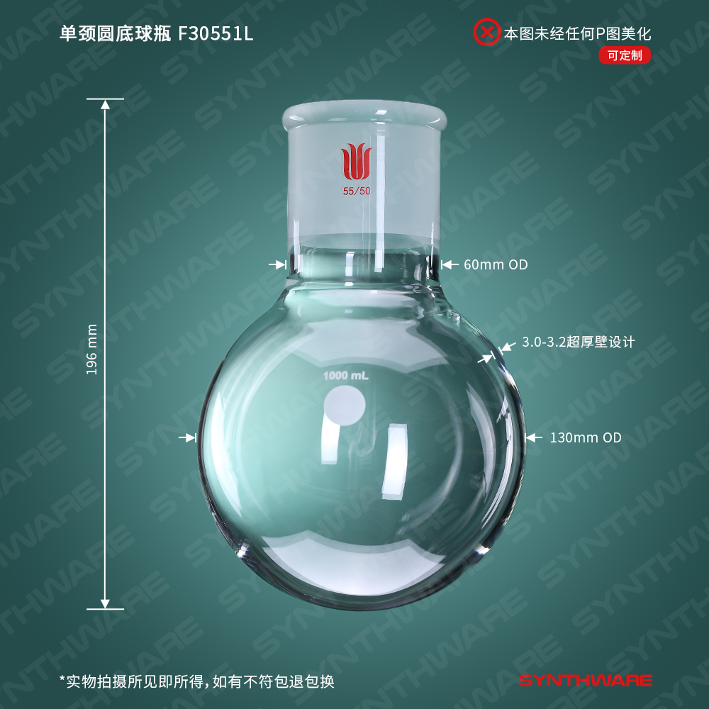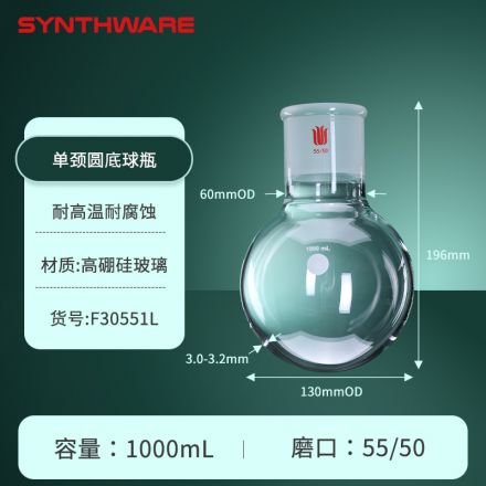 单颈圆底球瓶,厚壁高强度,磨口:55/50,1000ml F30551L