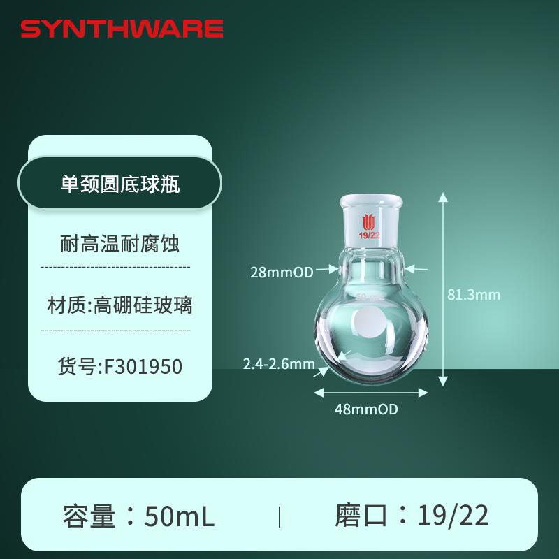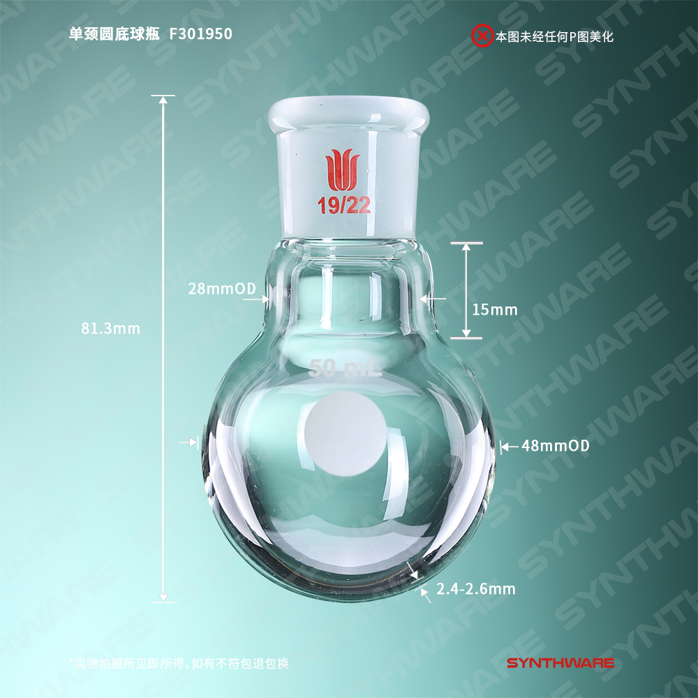 单颈圆底球瓶,厚壁高强度,磨口:19/22,50ml F301950