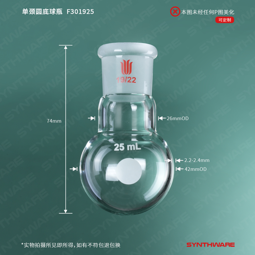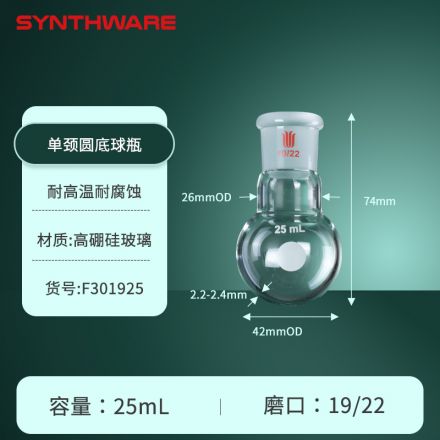 单颈圆底球瓶,厚壁高强度,磨口:19/22,25ml F301925