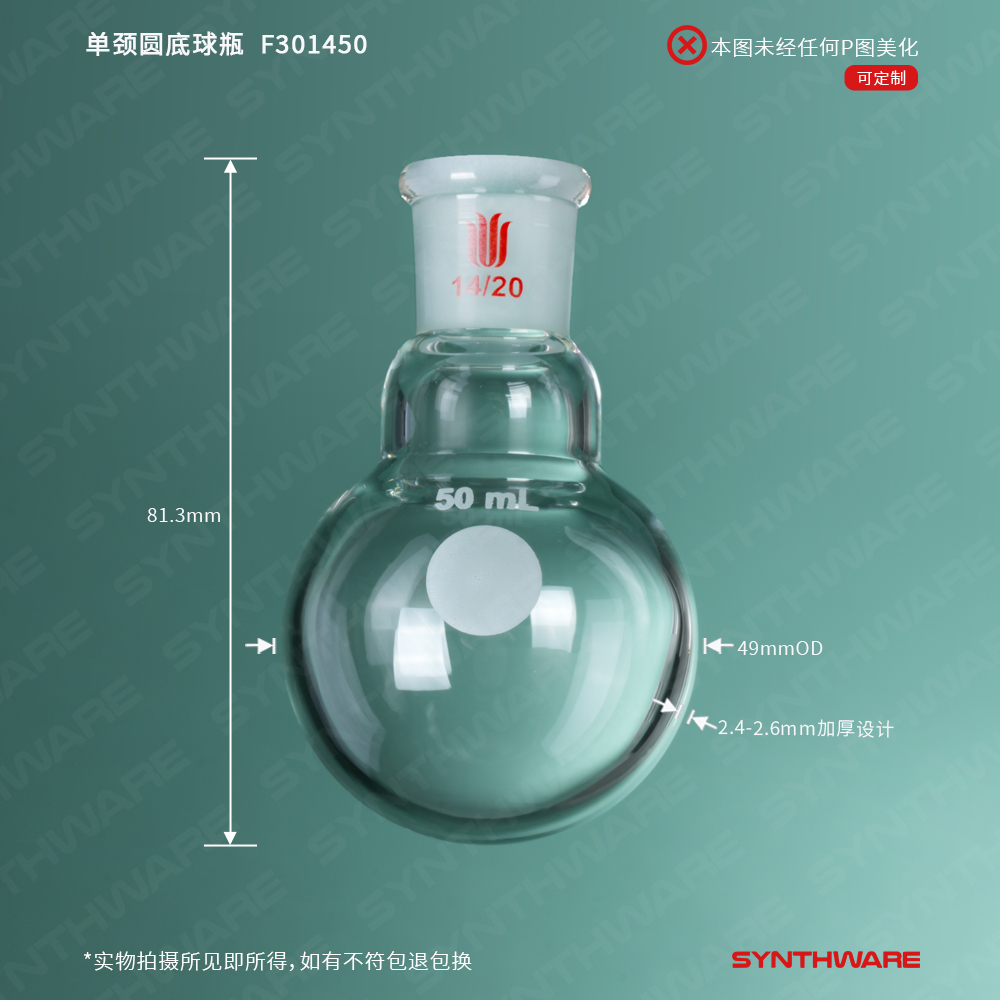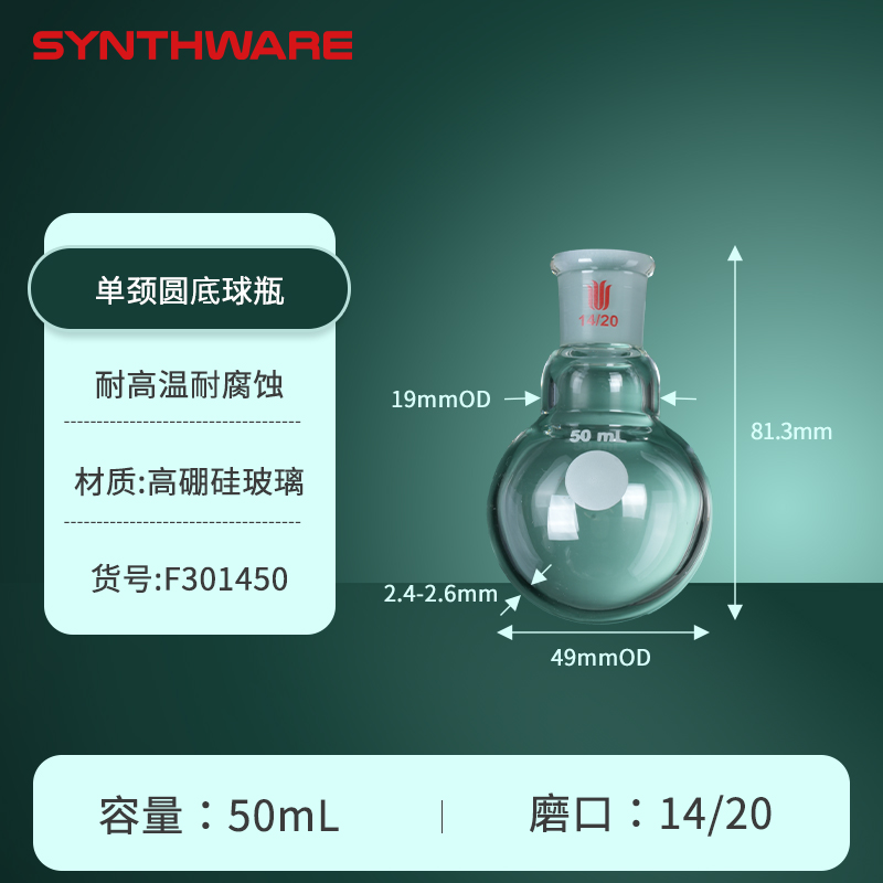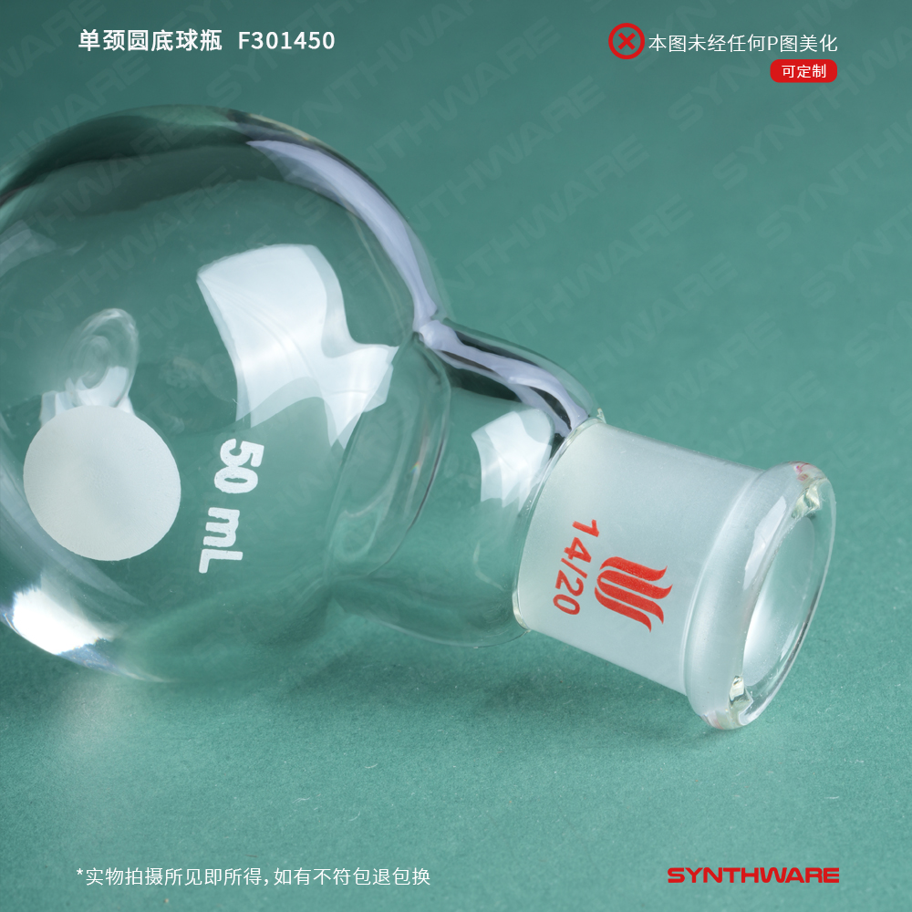 单颈圆底球瓶,厚壁高强度,磨口:14/20,50ml F301450