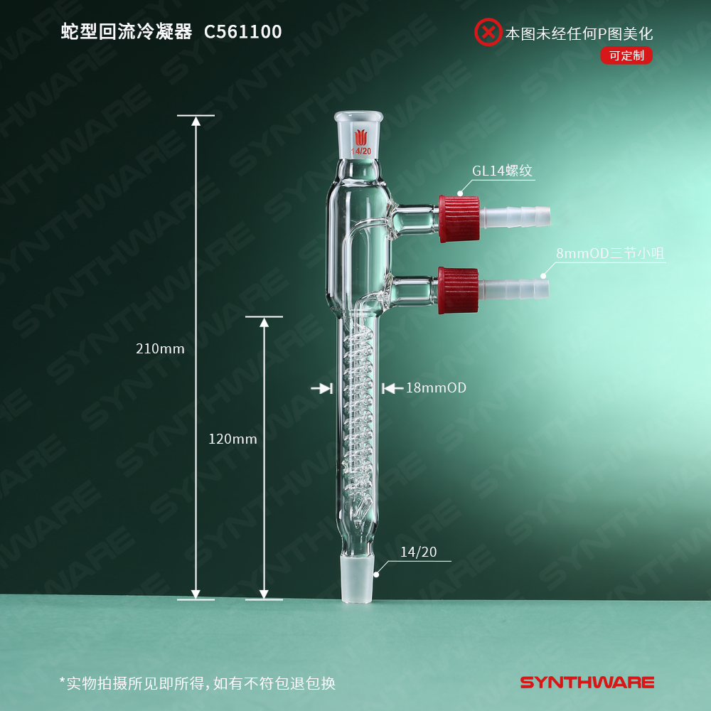 冷凝器 > 回流冷凝器 > 蛇型-具可拆式小咀回流冷凝器 > SYNTHWARE > 蛇型回流冷凝器,14/20,夹层长100mm,φ8mm可拆式小咀 C561100