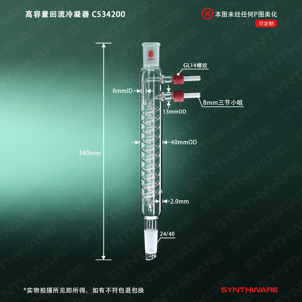 冷凝器 > 回流冷凝器 > 高容量-具可拆式小咀回流冷凝器 > SYNTHWARE > 高容量回流冷凝器,24/40,蛇冷长:200mm,φ8mm可拆式小咀 C534200