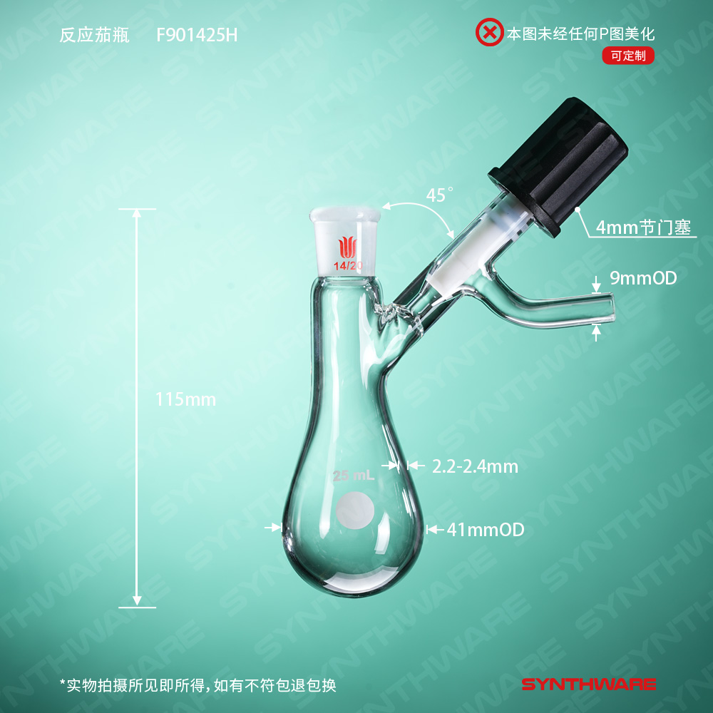 反应瓶 > 茄型反应瓶 > 高真空节门茄型反应瓶 > SYNTHWARE > 反应茄瓶,磨口:14/20,25ml,高真空阀 F901425H