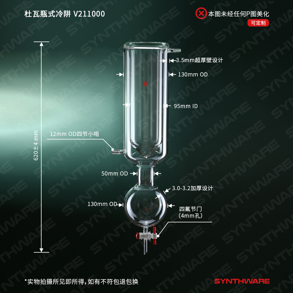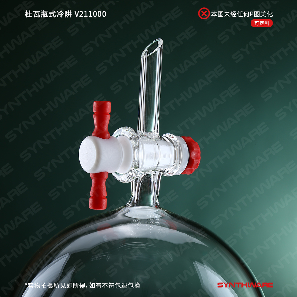 放置干冰, 杜瓦型冷阱,冷凝设计适用于大容量溶剂转移;可以选择玻璃节门达到更好的真空效果或选择四氟节门达到无油操作的目的,具10mm小咀。