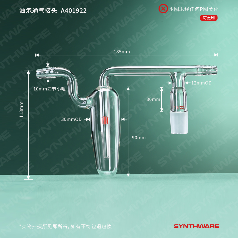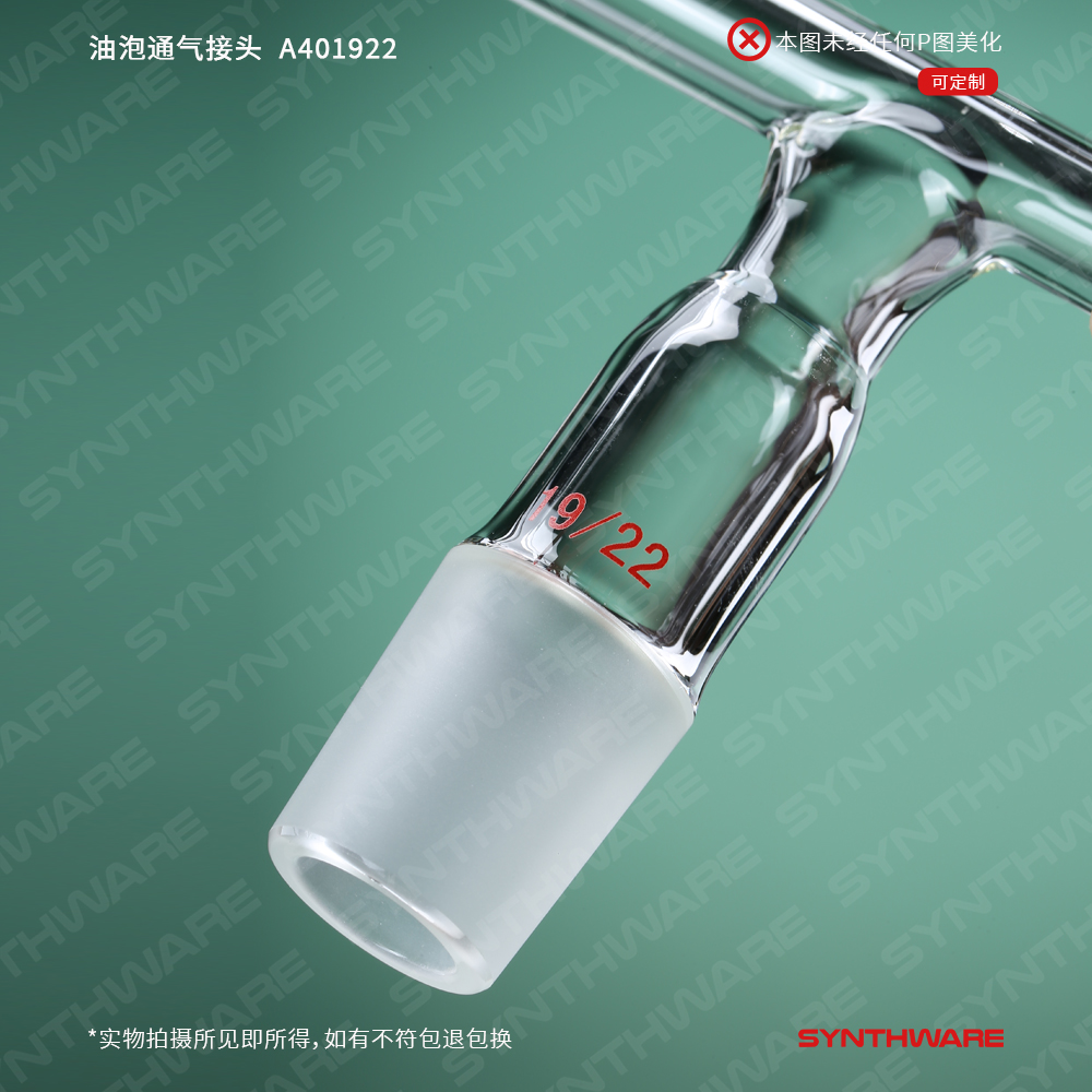 具微量鼓泡器的导气接头。左右两端为10mm小咀,分别与导气管和出气管相连,中间的磨口部分与反应体系相连。