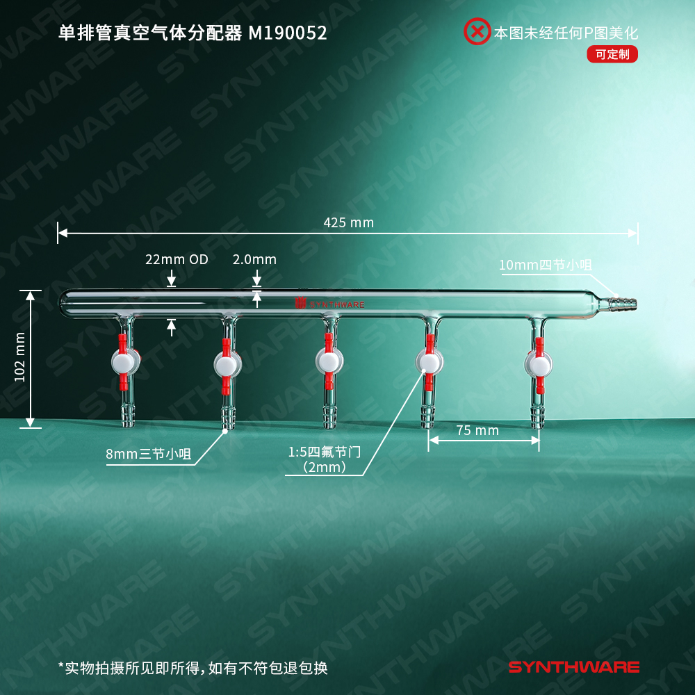 该型号单排管真空分配器,带2mm或4mm四氟节门。主管外径为22mm,右侧带10mm(外径)导气小咀。节门下部小咀外径为8mm或10mm,节门间距为75mm.。