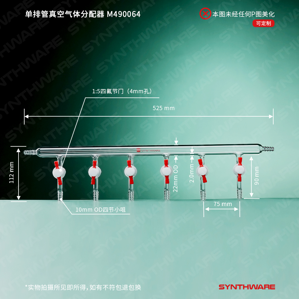 该型号单排管真空分配器,带2mm或4mm四氟节门。主管外径为22mm,右侧带10mm(外径)导气小咀。节门下部小咀外径为8mm或10mm,节门间距为75mm.。主管上带两个10mm(外径)导气小咀,分别在左右两侧。