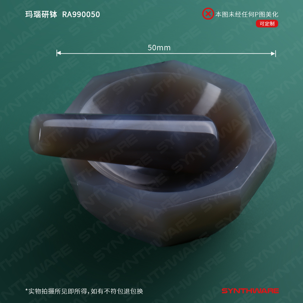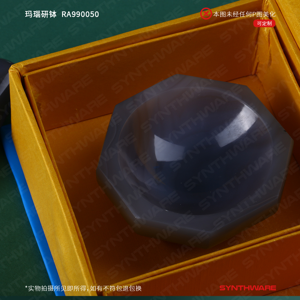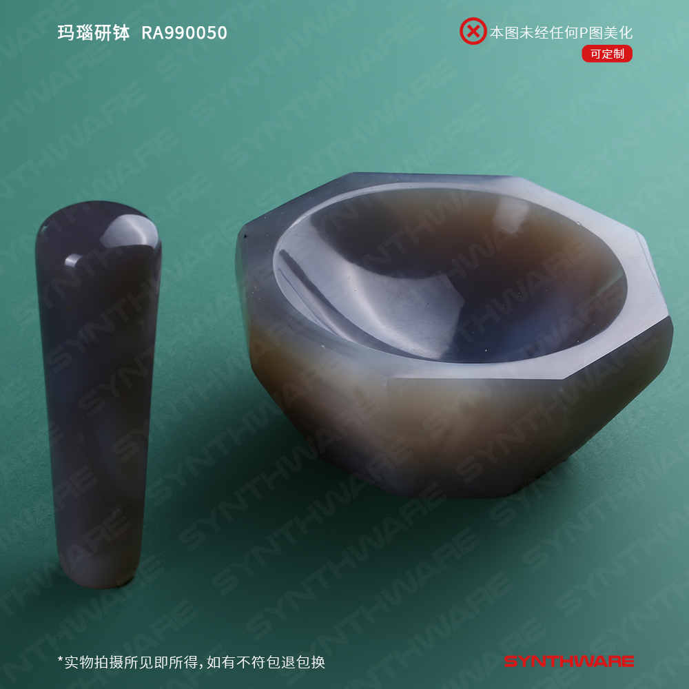 用于研磨固体物质或进行粉末状固体的混合。由于采用天然材料玛瑙制成,而且玛瑙越来越稀少,只能保证产品与药品接触表面无裂痕,无法保证钵体无裂痕,抗耐腐蚀性强,可在酸性研磨材料中使用。