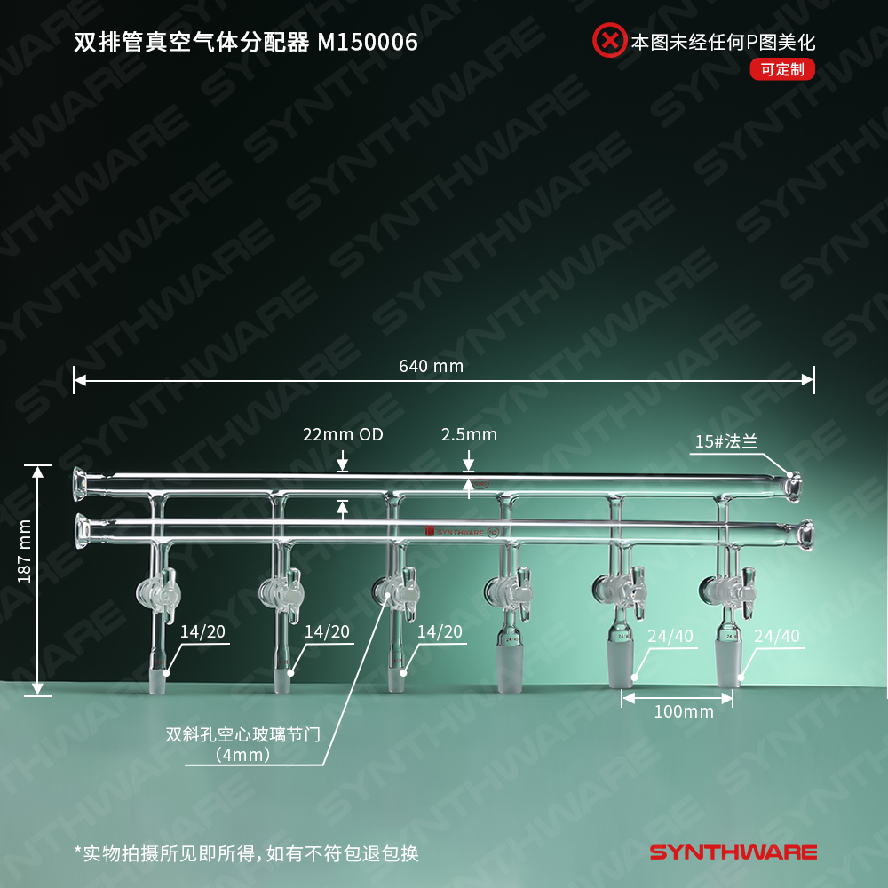 带4mm空心玻璃节门,共4组节门,节门下部分分别接有2个14/20号哨和2个24/40号哨。间距分别为75mm。主管道带4个15#法兰接口,可与15#法兰塞(S480015)和带15#法兰的抽气小咀(M13)配套使用,这两种种产品需单独订购。