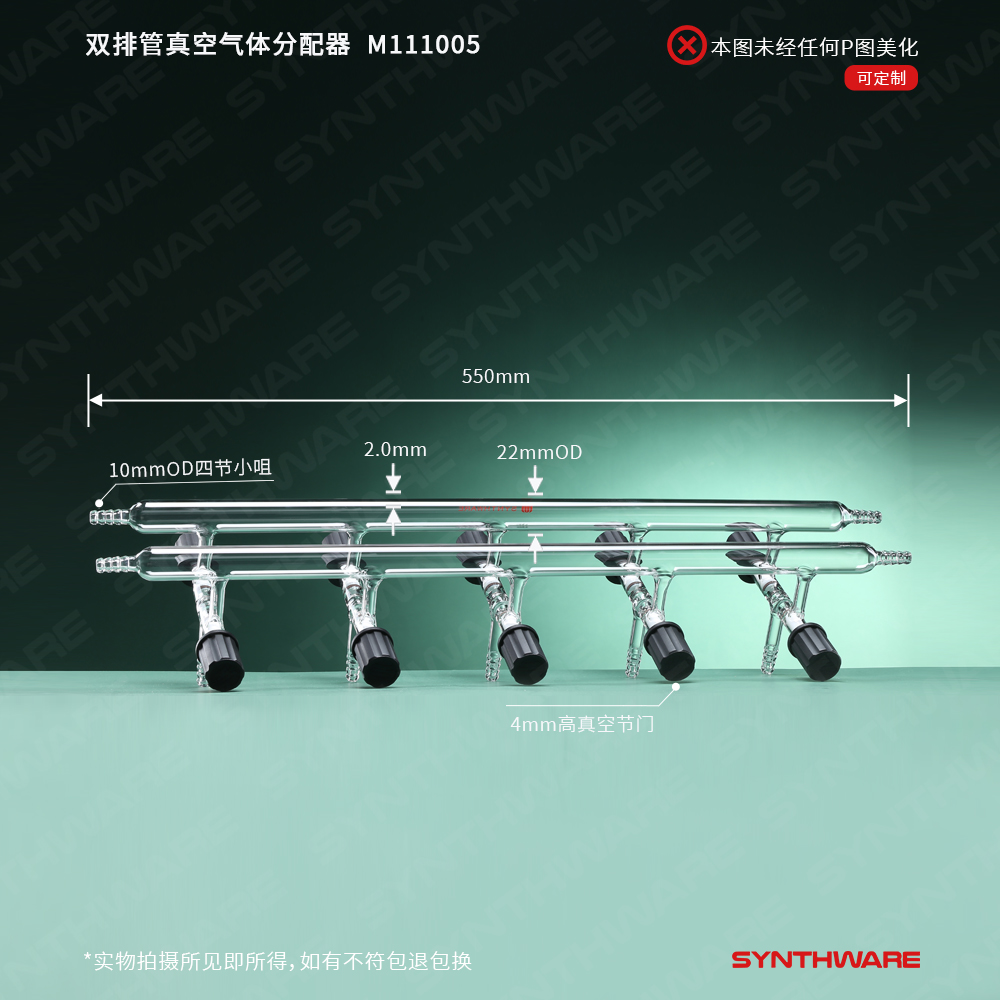 用于反应体系的惰性气体保护,一个管为真空抽气管,另一个管为惰性气体加入管,两个管以三通节门相连,从而控制真空和气体依次进入需保护的瓶中。双排管有不同的规格,可同时进行多组保护反应。该双排管配有0-4mm高真空节门。两个管均采用外径为22mm的中等壁厚玻璃管吹制而成,并带有四个小咀。每个出气小咀的外径为10mm, 每组高真空节门之间的间距为102mm。提示:其中后端真空管的两端分别接入真空泵和真空表。如用油泵,需在真空管油泵间接入冷阱和杜瓦瓶。其中前端惰性气体管的两端分别接入气体钢瓶和鼓泡器。