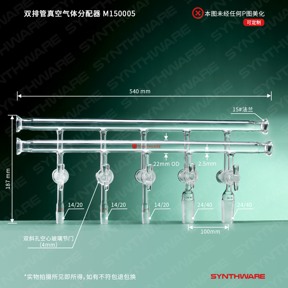带4mm空心玻璃节门,共4组节门,节门下部分分别接有2个14/20号哨和2个24/40号哨。间距分别为75mm。主管道带4个15#法兰接口,可与15#法兰塞(S480015)和带15#法兰的抽气小咀(M13)配套使用,这两种种产品需单独订购。