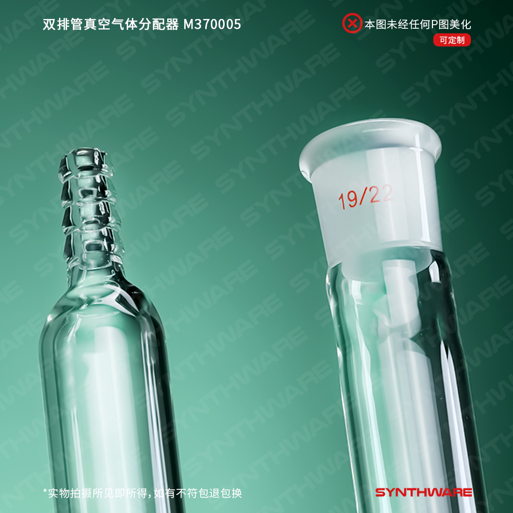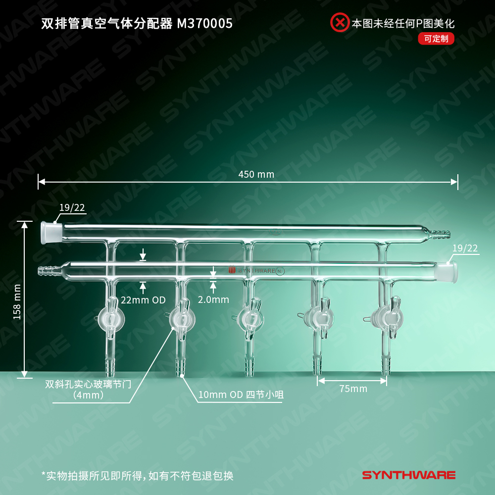 该型号双排管真空分配器为三通实心玻璃节门,配不锈钢弹簧及卡子,节门塞内有平行的双排导气孔。当节门旋转180°时,可切换通气流向。两个管的外径是22mm,两个小咀(前管左侧,后管右侧)的外径为10mm,每组出气小咀的外径为10mm,间距为75mm。每组出气小咀的外径为10mm,间距为75mm,前管右端及后管左端为19/22号磨口。