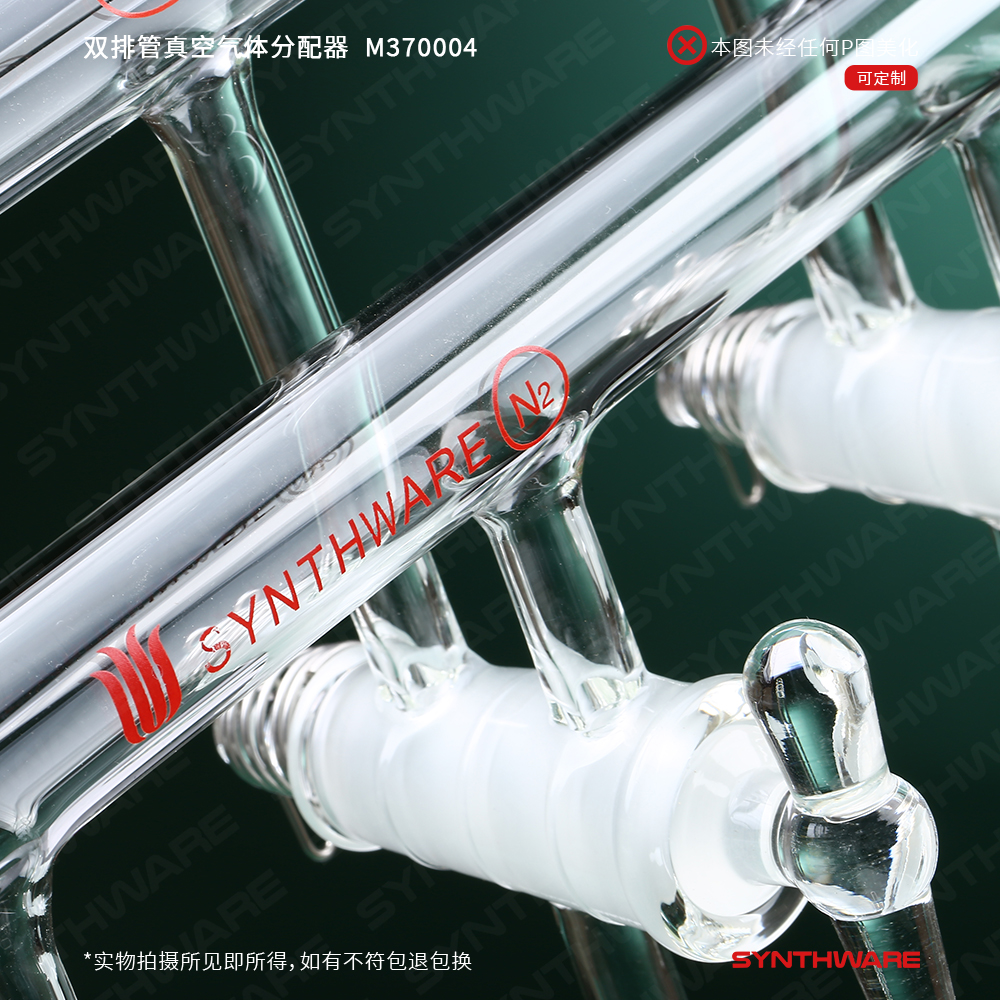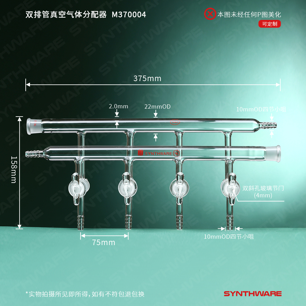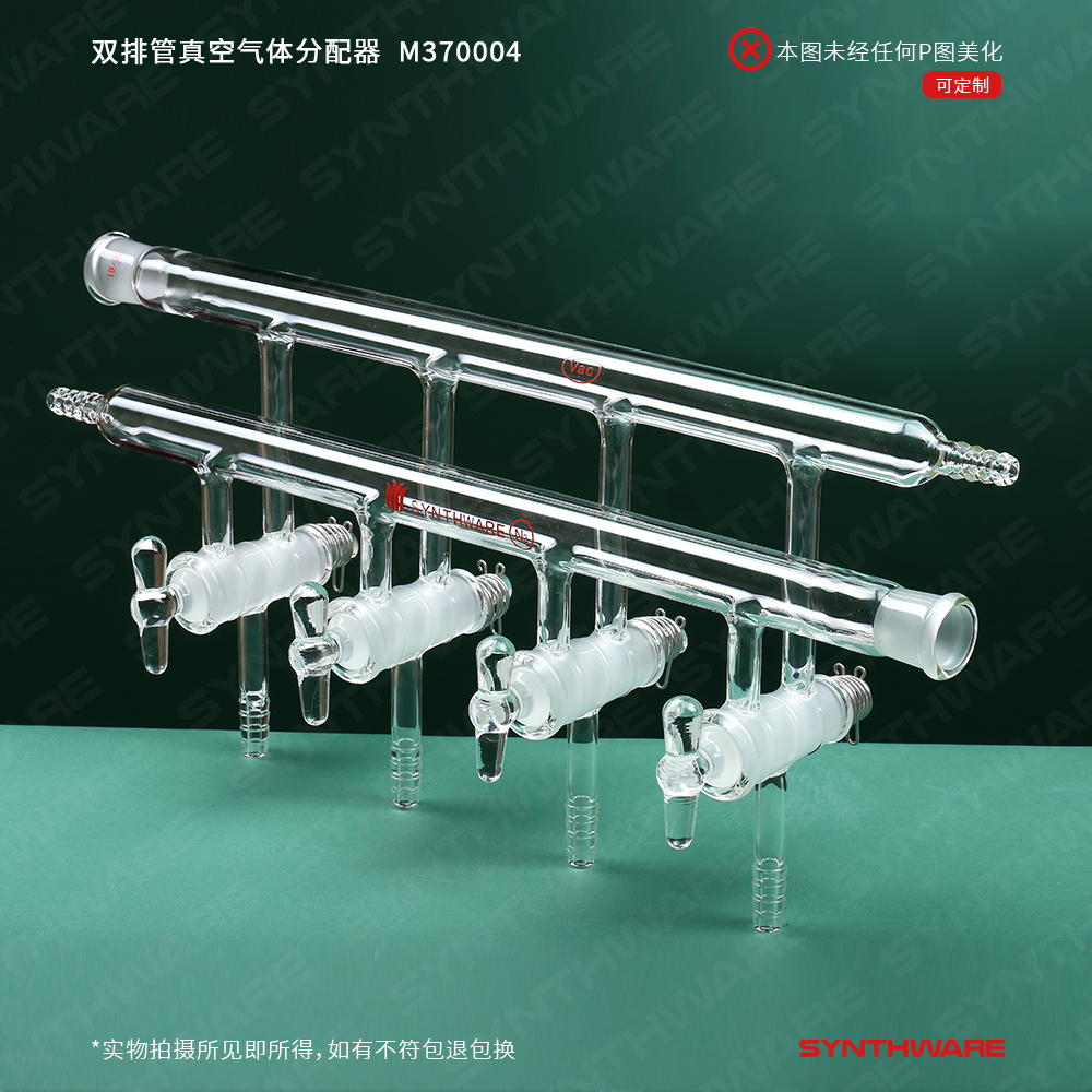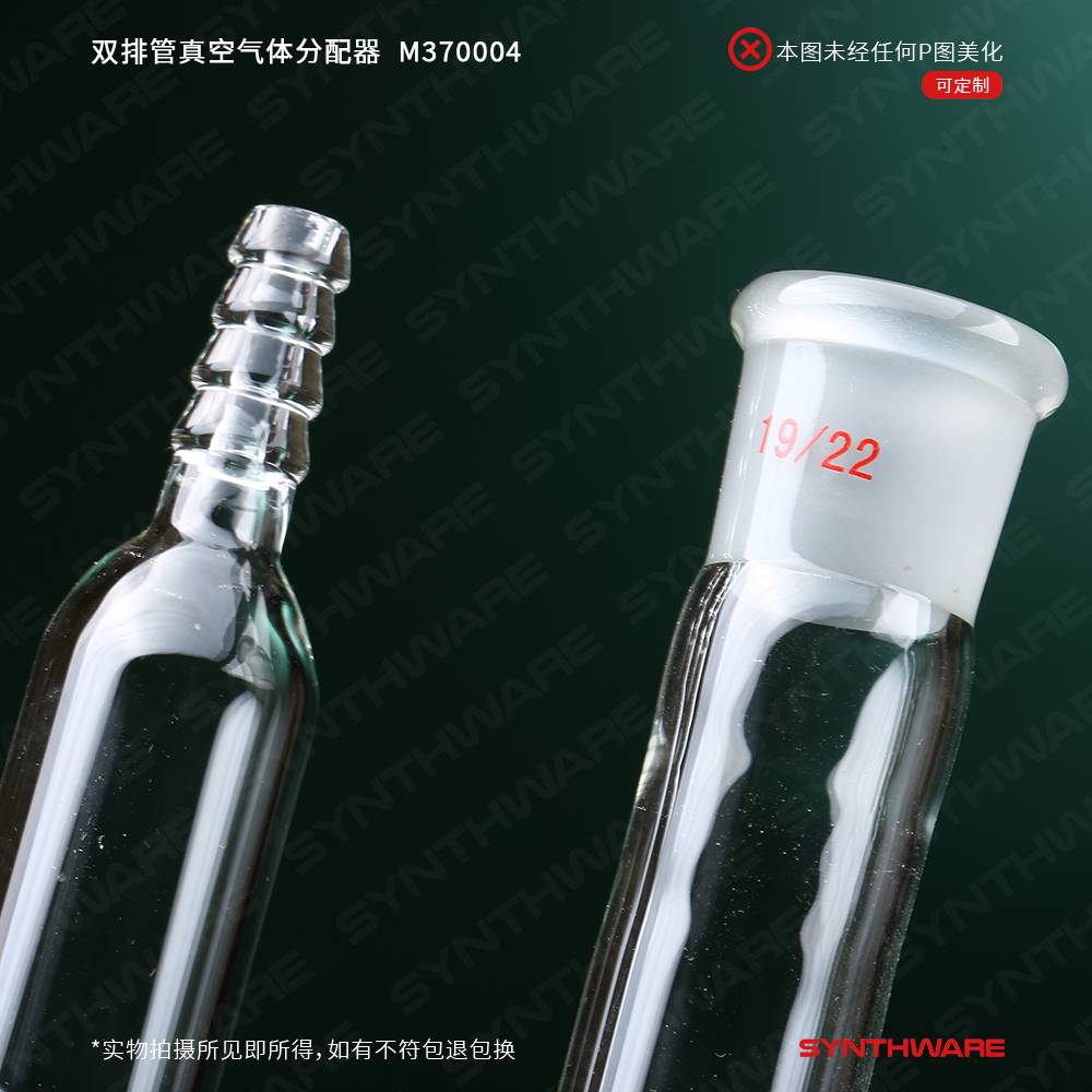 该型号双排管真空分配器为三通实心玻璃节门,配不锈钢弹簧及卡子,节门塞内有平行的双排导气孔。当节门旋转180°时,可切换通气流向。两个管的外径是22mm,两个小咀(前管左侧,后管右侧)的外径为10mm,每组出气小咀的外径为10mm,间距为75mm。每组出气小咀的外径为10mm,间距为75mm,前管右端及后管左端为19/22号磨口。