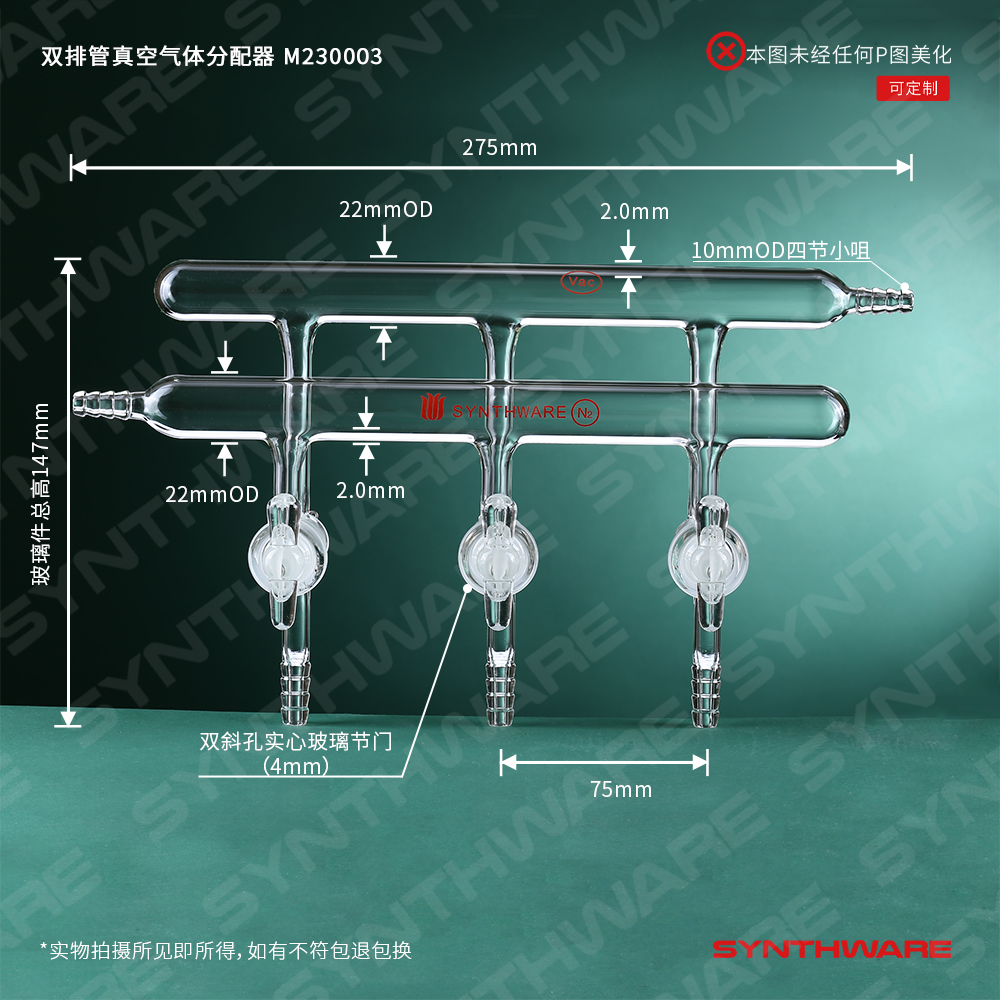 该型号双排管真空分配器为三通实心玻璃节门,配不锈钢弹簧及卡子,节门塞内有平行的双排导气孔。当节门旋转180°时,可切换通气流向。两个管的外径是22mm,两个小咀(前管左侧,后管右侧)的外径为10mm,每组出气小咀的外径为10mm,间距为75mm。