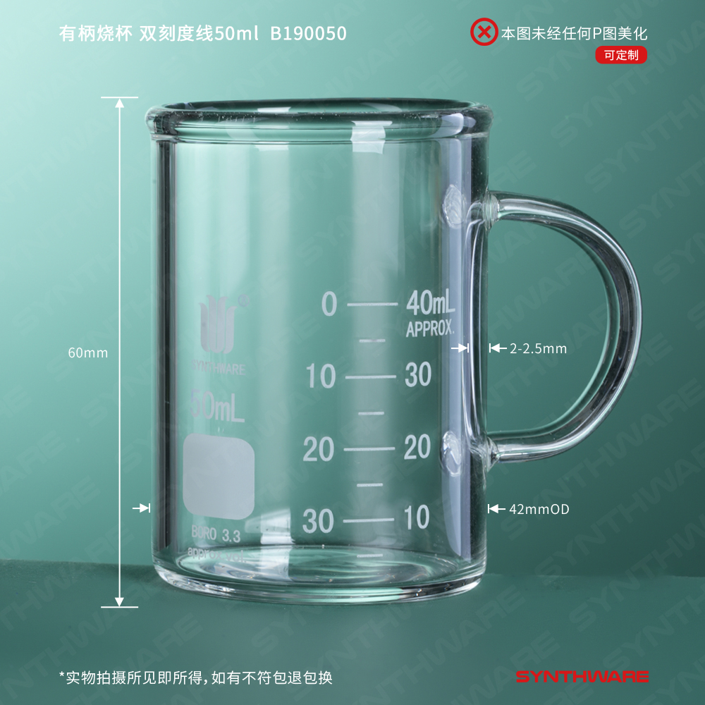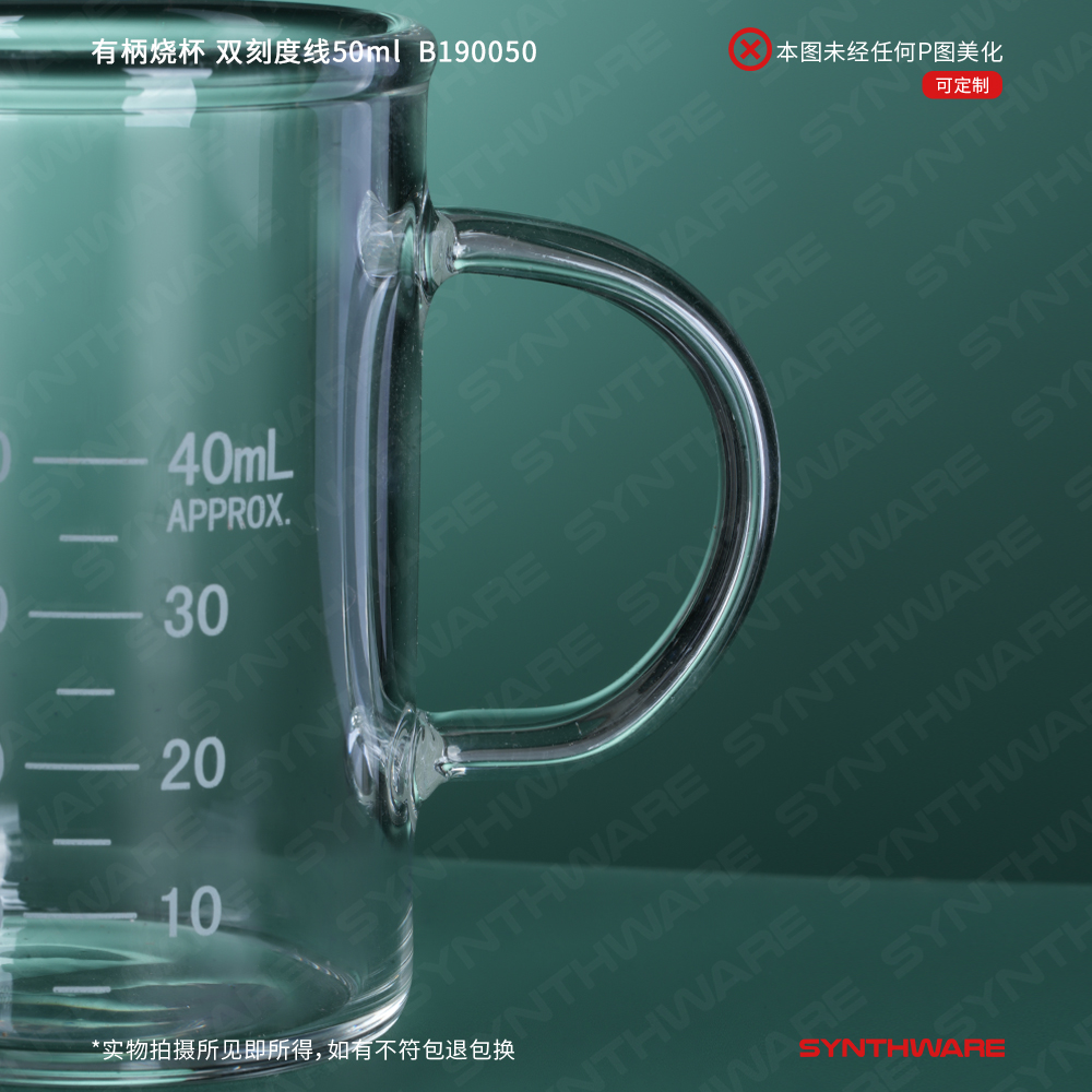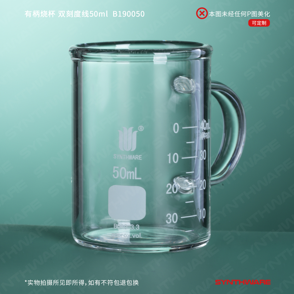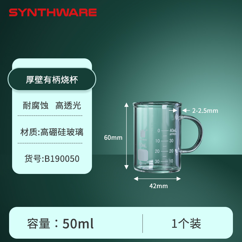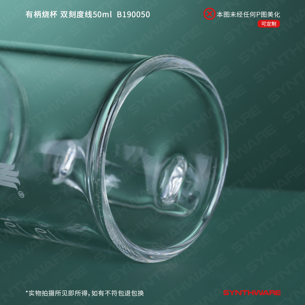 # 采用数控机床生产工艺使烧杯厚壁且均匀,烧杯壁和底部的厚度是市场上普通烧杯壁厚的2倍。烧杯整体加厚设计,增加了烧杯的抗机械冲击强度。