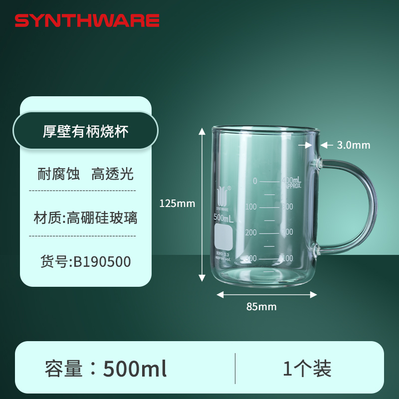 自制厚壁烧杯,双刻度线500ml,直径85*高度125*壁厚3.0mm,10个/盒 B220500