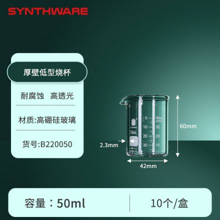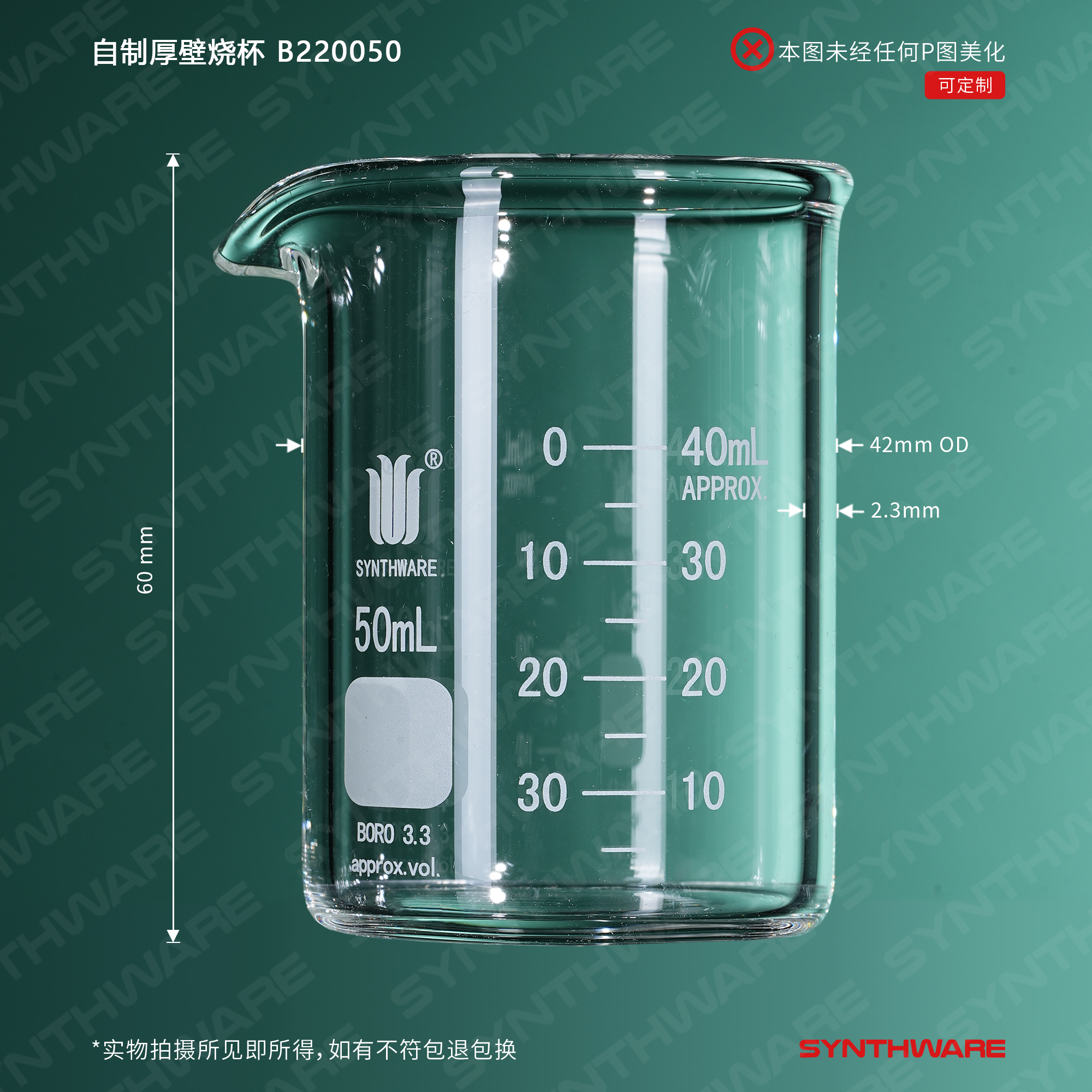 自制厚壁烧杯,双刻度线50ml,直径42*高度60*壁厚2.3mm,10个/盒 B220050