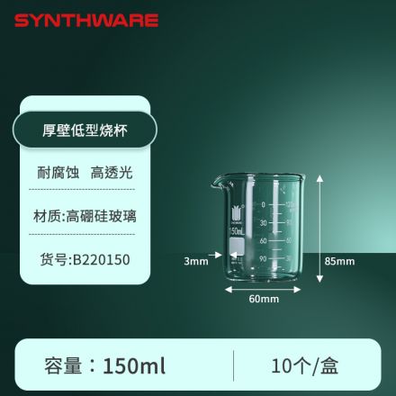 自制厚壁烧杯,双刻度线150ml,直径60*高度80*壁厚3.0mm,10个/盒 B220150