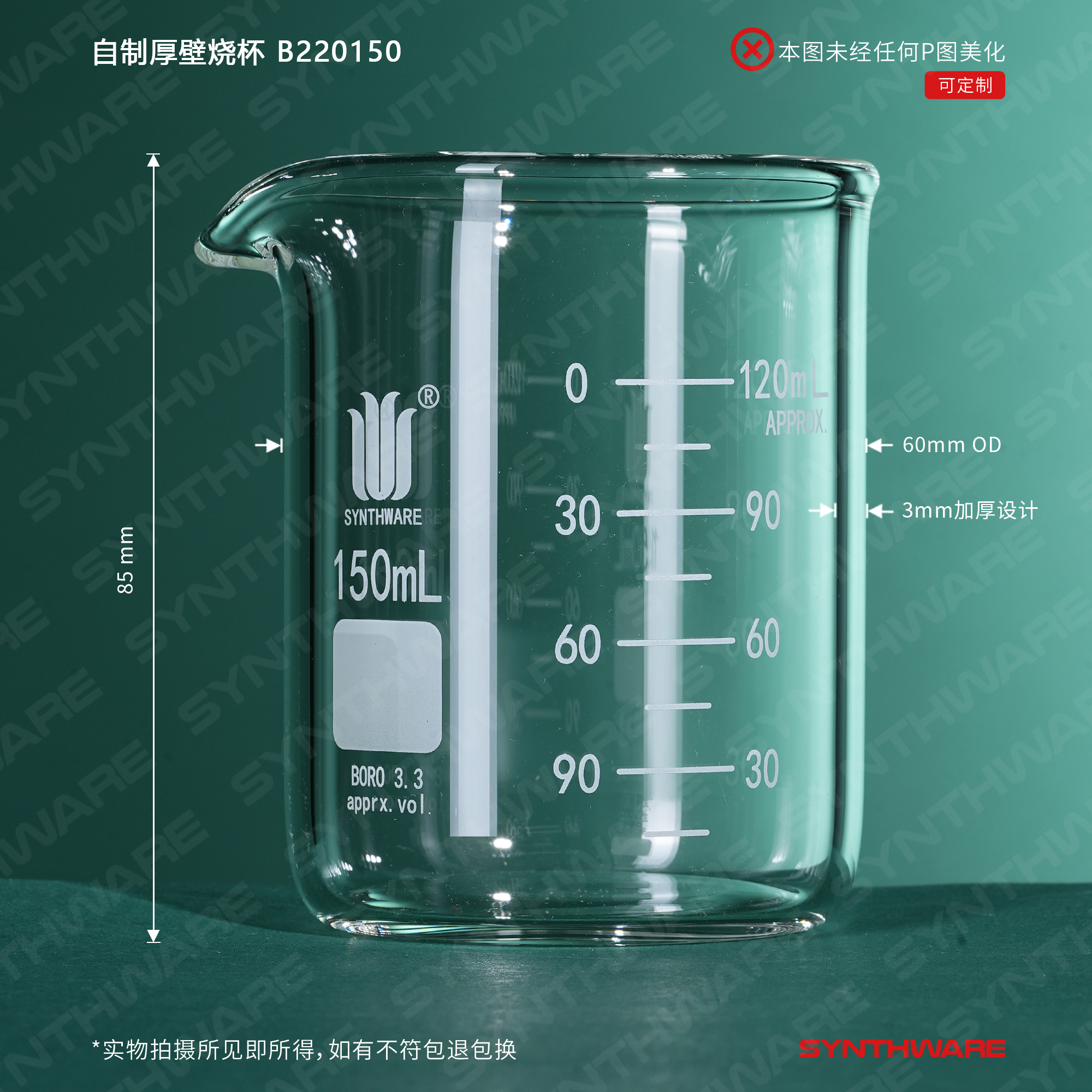 # 采用数控机床生产工艺使烧杯厚壁且均匀,烧杯壁和底部的厚度是市场上普通烧杯壁厚的2倍。烧杯整体加厚设计,增加了烧杯的抗机械冲击强度。