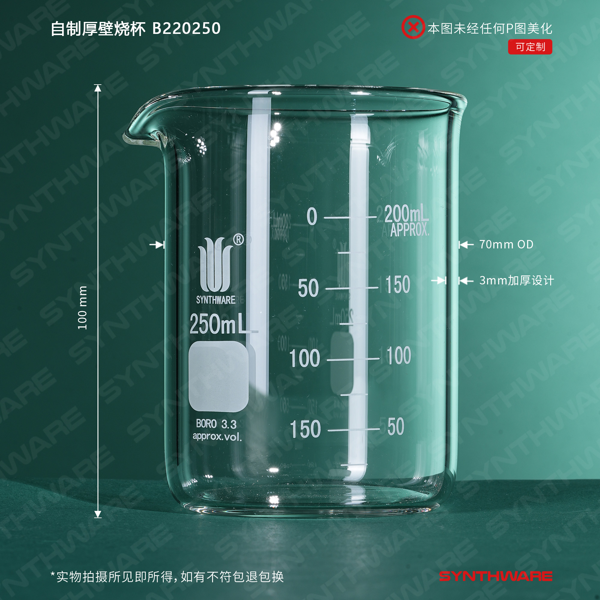 # 采用数控机床生产工艺使烧杯厚壁且均匀,烧杯壁和底部的厚度是市场上普通烧杯壁厚的2倍。烧杯整体加厚设计,增加了烧杯的抗机械冲击强度。